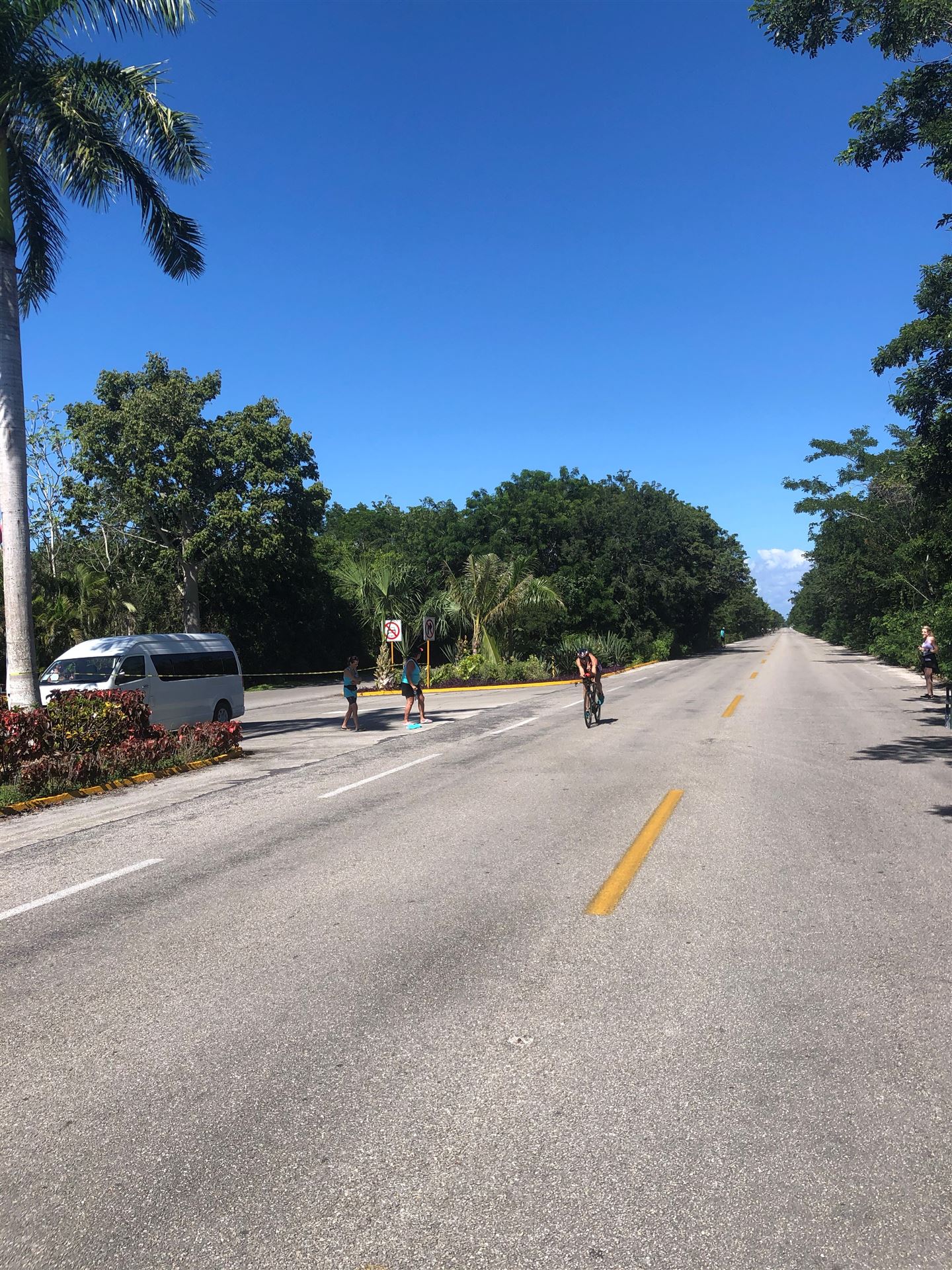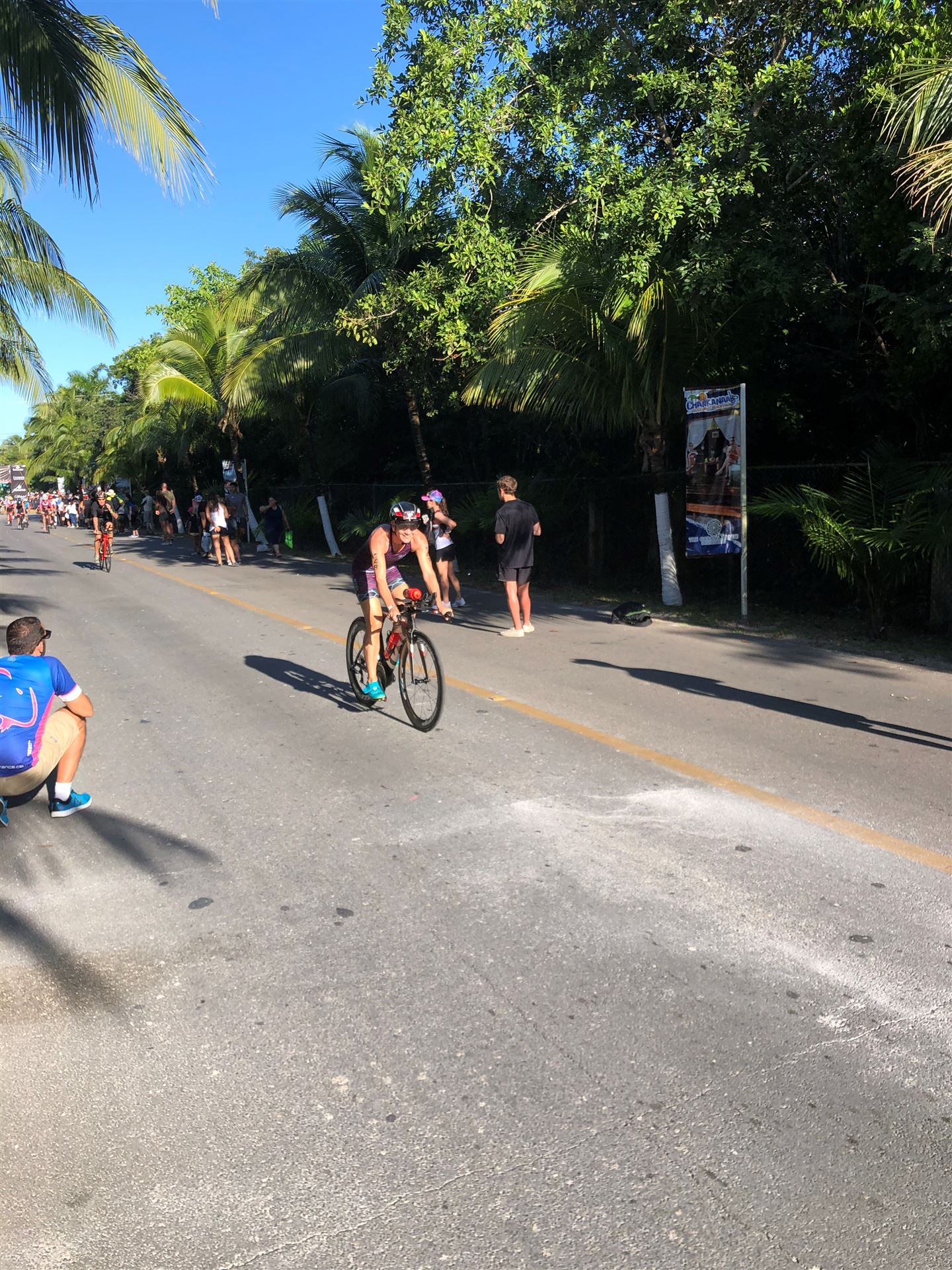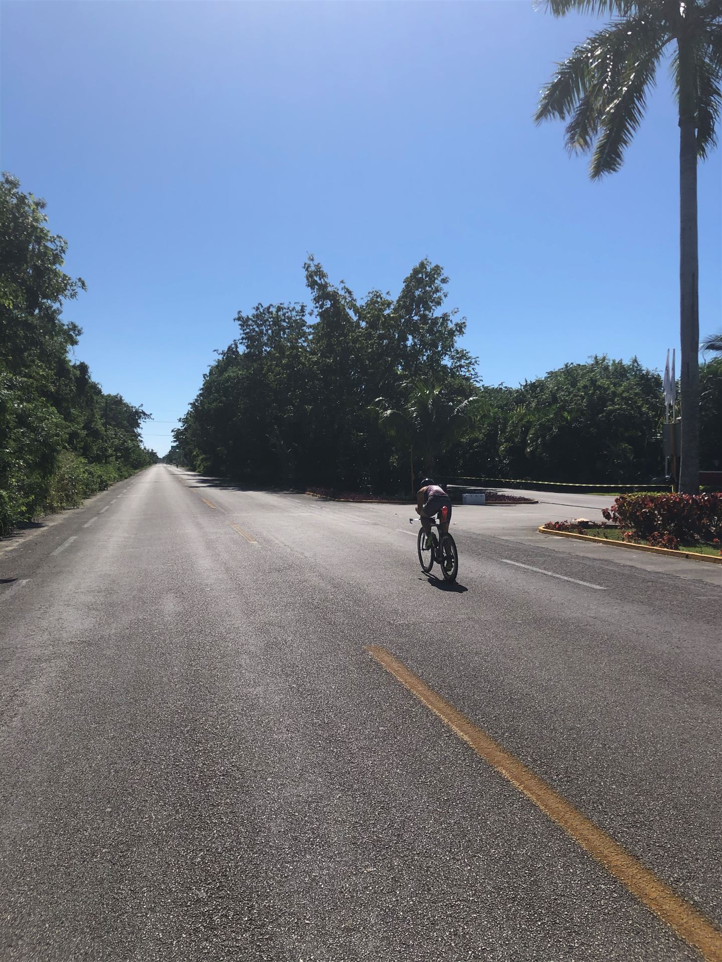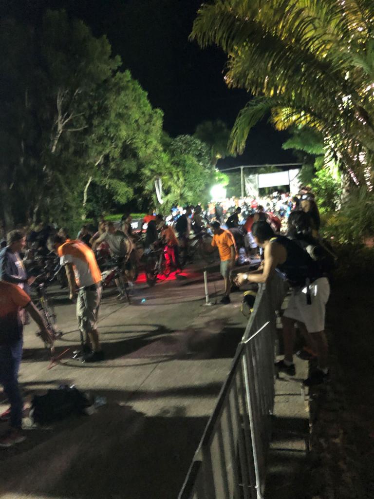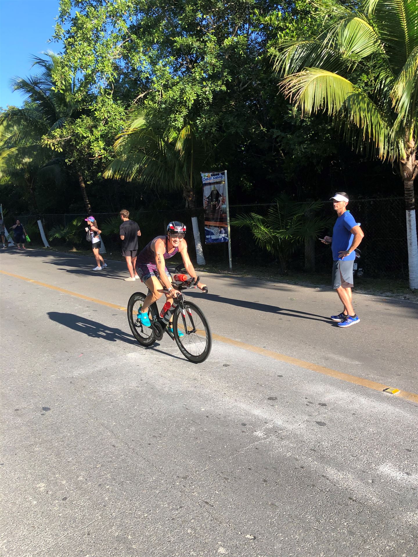 Um kurz vor 7:00 Uhr ist die Nacht vorbei. Da es relativ früh dunkel wird, steht man auch entsprechend früh auf. Nach dem Frühstück geht es mit dem Rad los. Einmal die Wettkampfstrecke abfahren, sprich einmal um die Insel. Inzwischen sind einige Athleten unterwegs. Es gibt einen tollen Radweg, der fast komplett parallel zur Straße geht. Es gibt kaum Verkehr, der Wind ist okay, die Wettkampfstrecke ohne Überraschungen. Unterwegs gibt es sogar Schilder mit dem Hinweis Athleten im Training. Eine Runde sind circa 63 Kilometer, fast alles mit Radweg. Nur das Stück durch die Stadt ist etwas blöd, der Rest jedoch perfekt. Im Anschluss an das Rad fahren stehen noch 30 Minuten lockere Grundlage Laufen auf dem Plan. Danach liegen wir etwas im Schatten am Pool. Inzwischen sind noch einige Athleten im Club angekommen. Zum Abendessen gibt es heute mal Buffet, danach noch etwas chillen und dann ab ins Bett.