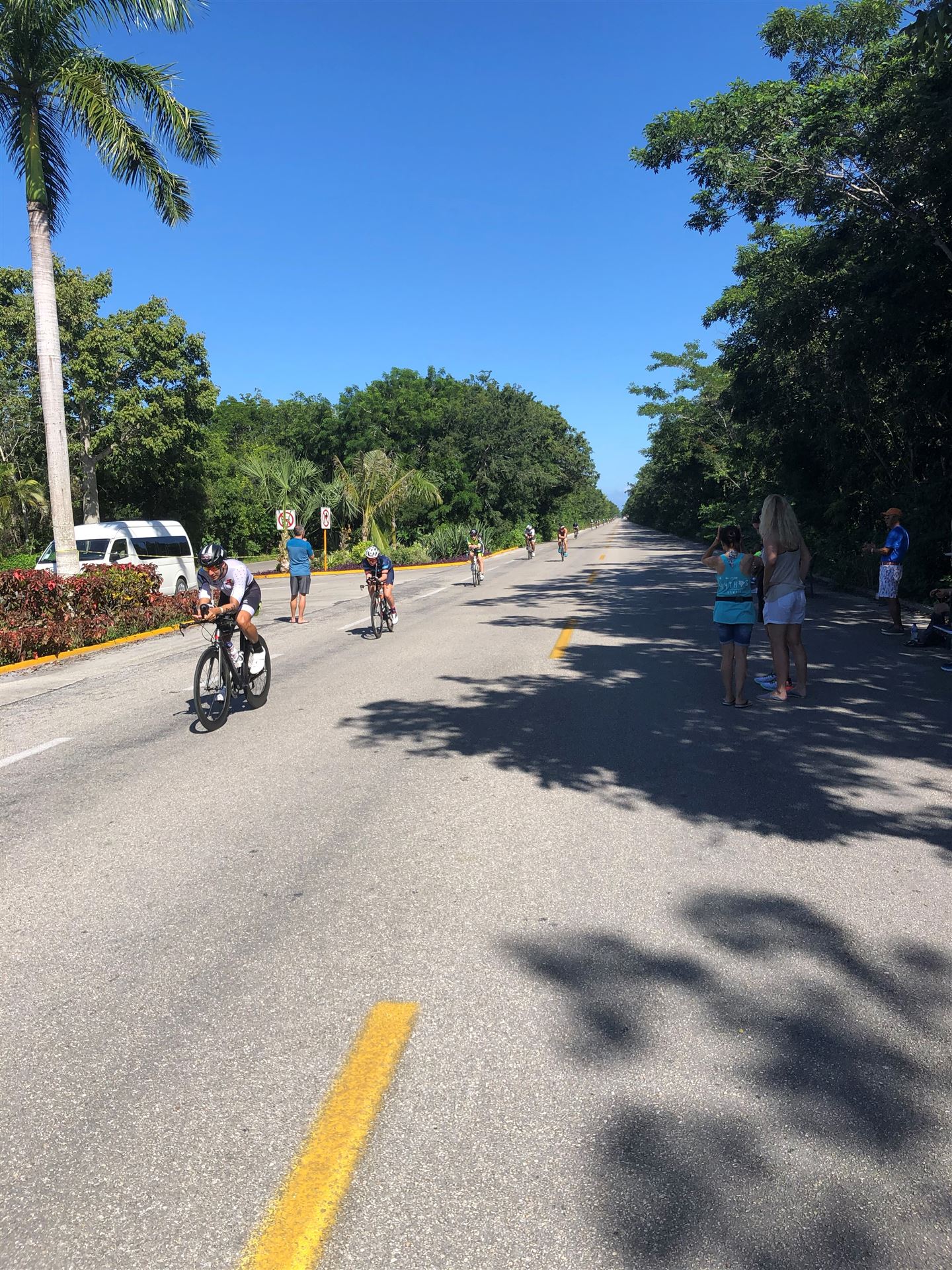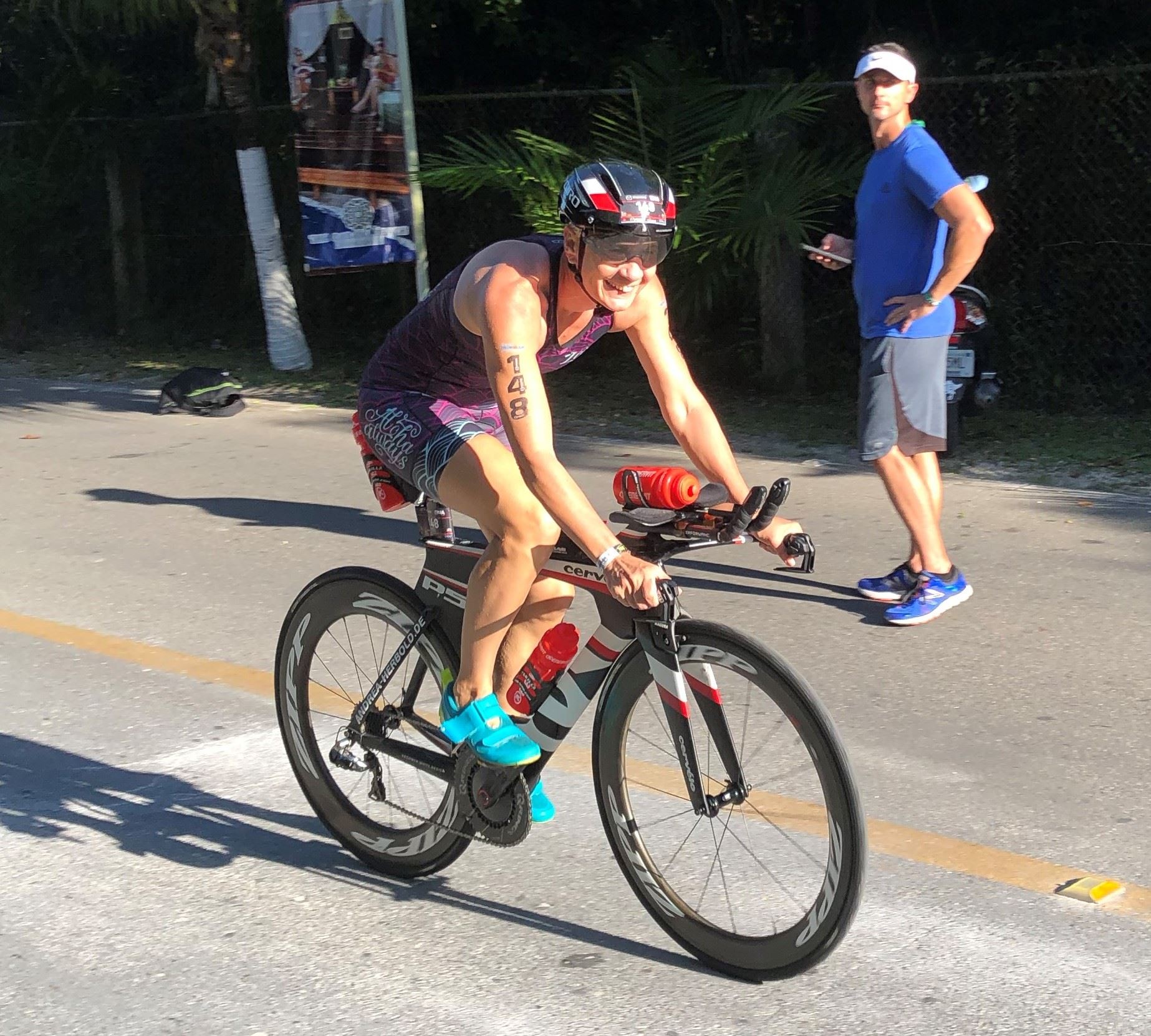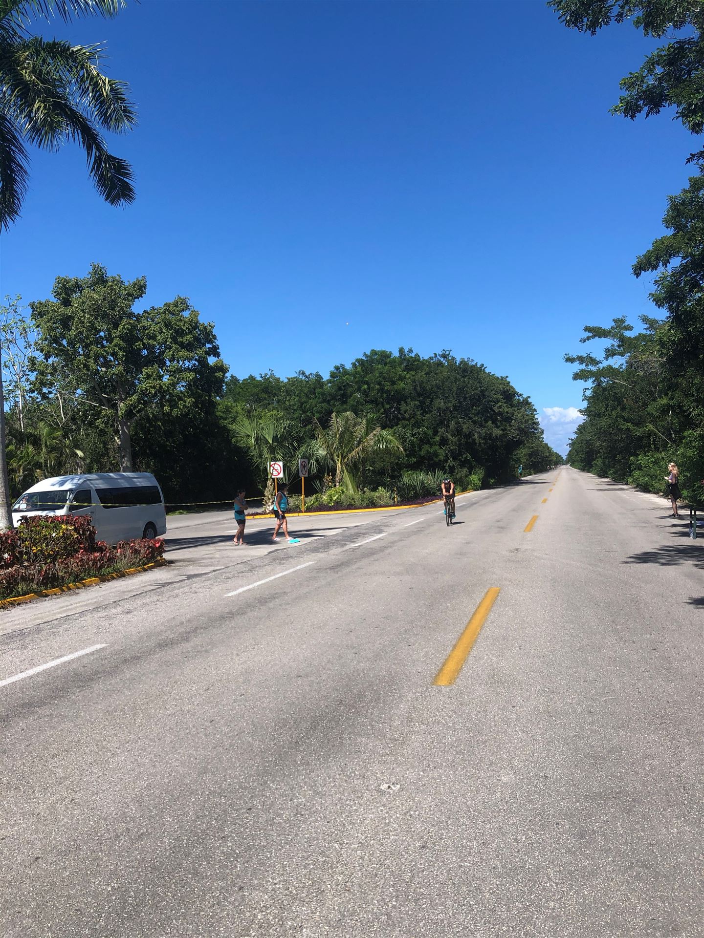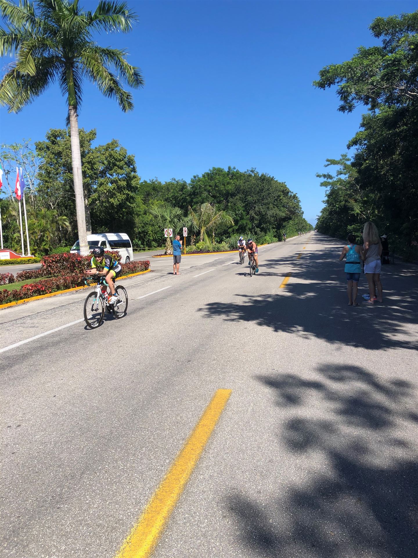 Um kurz vor 7:00 Uhr ist die Nacht vorbei. Da es relativ früh dunkel wird, steht man auch entsprechend früh auf. Nach dem Frühstück geht es mit dem Rad los. Einmal die Wettkampfstrecke abfahren, sprich einmal um die Insel. Inzwischen sind einige Athleten unterwegs. Es gibt einen tollen Radweg, der fast komplett parallel zur Straße geht. Es gibt kaum Verkehr, der Wind ist okay, die Wettkampfstrecke ohne Überraschungen. Unterwegs gibt es sogar Schilder mit dem Hinweis Athleten im Training. Eine Runde sind circa 63 Kilometer, fast alles mit Radweg. Nur das Stück durch die Stadt ist etwas blöd, der Rest jedoch perfekt. Im Anschluss an das Rad fahren stehen noch 30 Minuten lockere Grundlage Laufen auf dem Plan. Danach liegen wir etwas im Schatten am Pool. Inzwischen sind noch einige Athleten im Club angekommen. Zum Abendessen gibt es heute mal Buffet, danach noch etwas chillen und dann ab ins Bett.