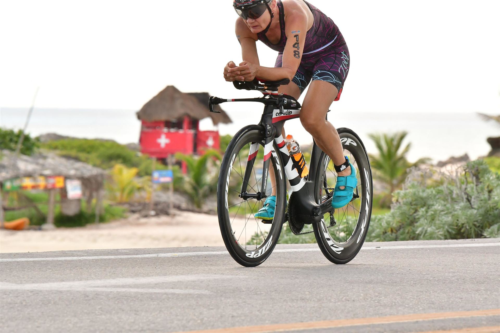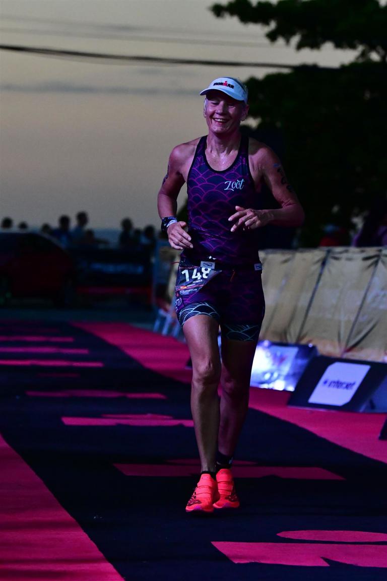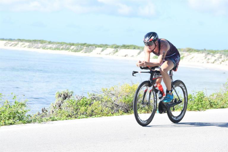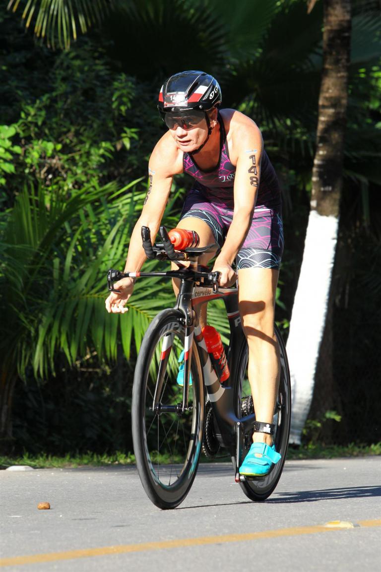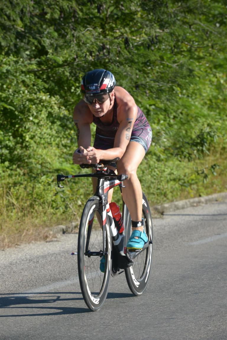 Zügig zum Rad und dann ab auf die erste Runde. Da mein Magen noch immer rebelliert verzichte ich die erste Zeit auf jegliche Nahrungs- bzw. Flüssigkeitsaufnahme. Das erste Stück geht an diversen Hotels und Restaurants vorbei. Die Strecke ist überwiegend geradeaus. Nichts spektakuläres. Ein großes Teilstück verläuft parallel zum Meer, der Ausblick ist einfach toll. Schön, wenn man während einem Rennen noch solch ein Panorama genießen kann. Am Anfang ist die Radstrecke noch etwas voll, das wird jedoch von Kilometer zu Kilometer besser. Ich fühle mich sehr gut und kann mein Tempo fahren. Ich freue mich, wenn ich den ein- oder anderen Athleten überholen kann, das bringt zusätzliche Motivation. Ich versuche die meiste Zeit abgelegt zu fahren, das minimiert den Windwiderstand. Die Verpflegungsstellen sind sehr dicht beieinander, man kann seine Flaschen auffüllen und sich mit Wasser kühlen. Ist perfekt organisiert. Insgesamt muss man 3 Runden fahren. 2 x 63 Kilometer und die letzte Runde noch 54 Kilometer. Ich versuche möglichst konstant mein Tempo zu fahren und fühle mich ausgezeichnet. Es steht ja im Anschluss noch ein Marathon an. Das Gefühl ist toll, als ich nach 3 Runden in Richtung Wechselzone abbiegen kann und bin erstaunt, wie viele erst jetzt auf die 3. Runde gehen. Schnell das TT Bike an einen Helfer abgeben und dann mit dem Laufbeutel ins Wechselzelt. Meine Radzeit von 5:30:34 ist eine tolle Zeit für mich.