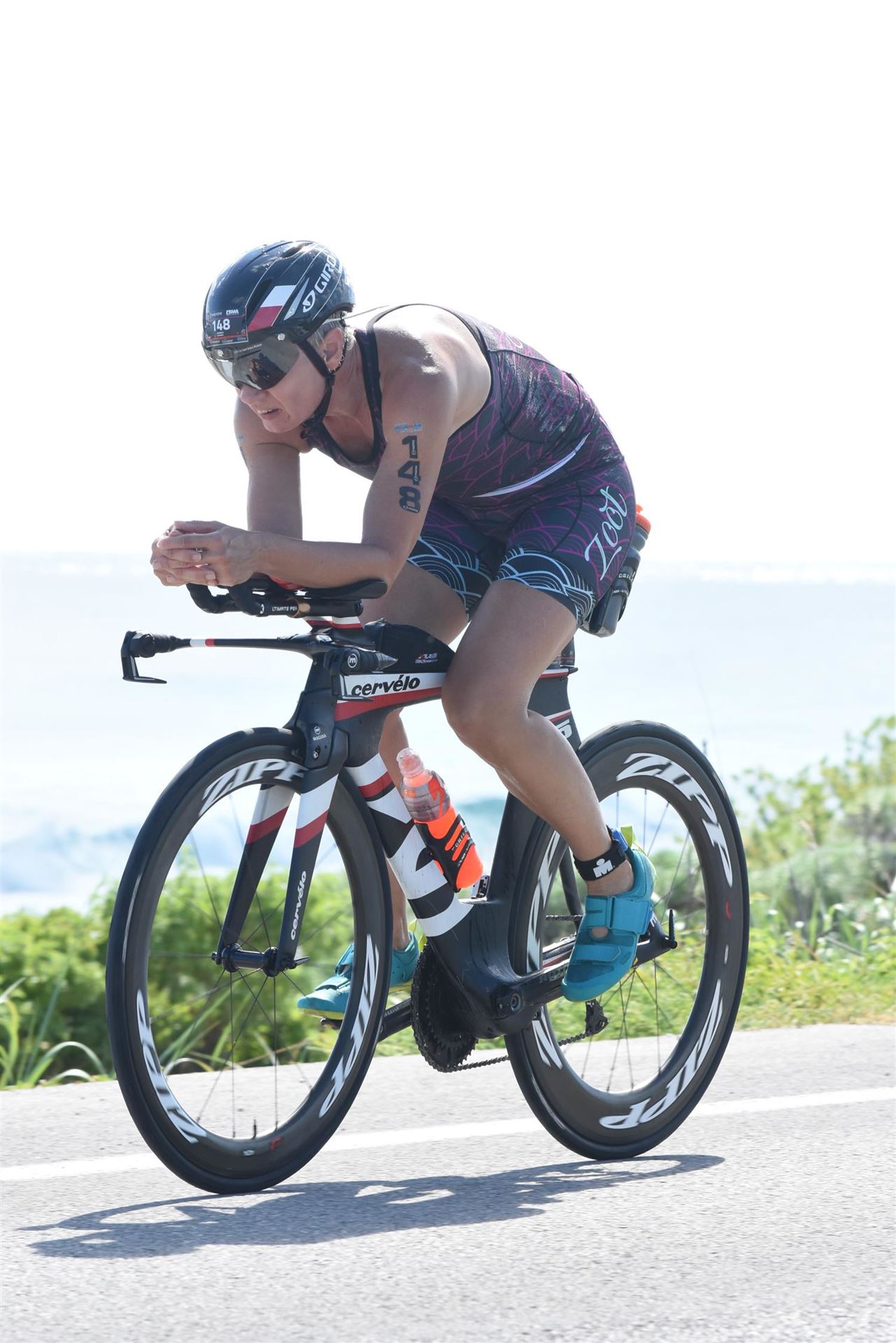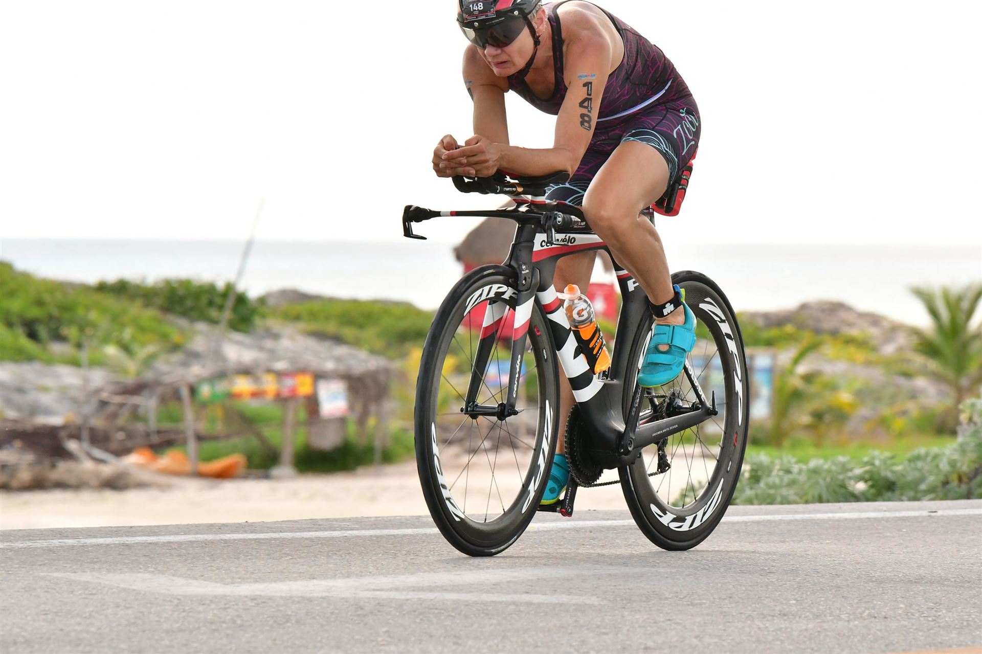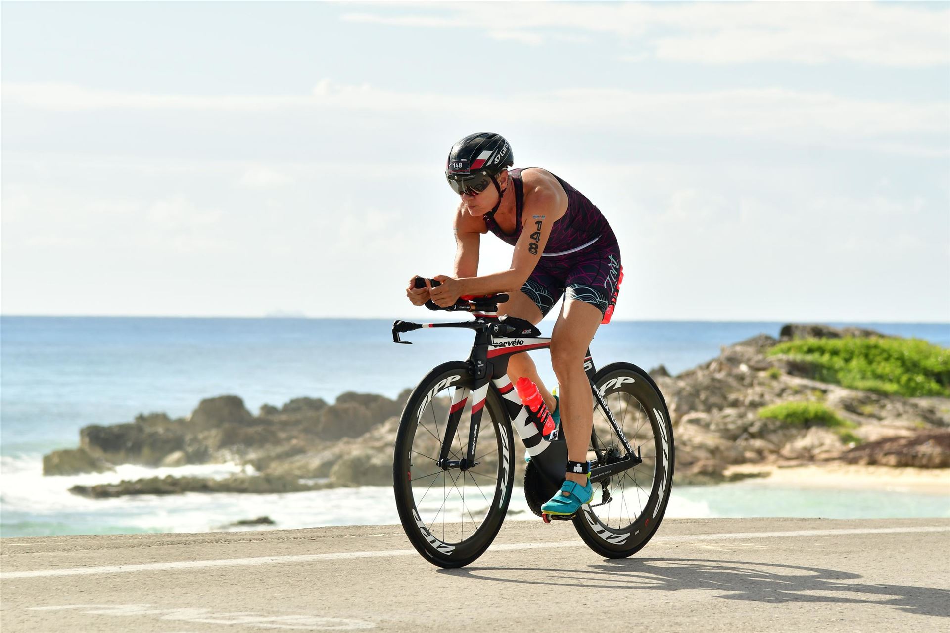 Zügig zum Rad und dann ab auf die erste Runde. Da mein Magen noch immer rebelliert verzichte ich die erste Zeit auf jegliche Nahrungs- bzw. Flüssigkeitsaufnahme. Das erste Stück geht an diversen Hotels und Restaurants vorbei. Die Strecke ist überwiegend geradeaus. Nichts spektakuläres. Ein großes Teilstück verläuft parallel zum Meer, der Ausblick ist einfach toll. Schön, wenn man während einem Rennen noch solch ein Panorama genießen kann. Am Anfang ist die Radstrecke noch etwas voll, das wird jedoch von Kilometer zu Kilometer besser. Ich fühle mich sehr gut und kann mein Tempo fahren. Ich freue mich, wenn ich den ein- oder anderen Athleten überholen kann, das bringt zusätzliche Motivation. Ich versuche die meiste Zeit abgelegt zu fahren, das minimiert den Windwiderstand. Die Verpflegungsstellen sind sehr dicht beieinander, man kann seine Flaschen auffüllen und sich mit Wasser kühlen. Ist perfekt organisiert. Insgesamt muss man 3 Runden fahren. 2 x 63 Kilometer und die letzte Runde noch 54 Kilometer. Ich versuche möglichst konstant mein Tempo zu fahren und fühle mich ausgezeichnet. Es steht ja im Anschluss noch ein Marathon an. Das Gefühl ist toll, als ich nach 3 Runden in Richtung Wechselzone abbiegen kann und bin erstaunt, wie viele erst jetzt auf die 3. Runde gehen. Schnell das TT Bike an einen Helfer abgeben und dann mit dem Laufbeutel ins Wechselzelt. Meine Radzeit von 5:30:34 ist eine tolle Zeit für mich.