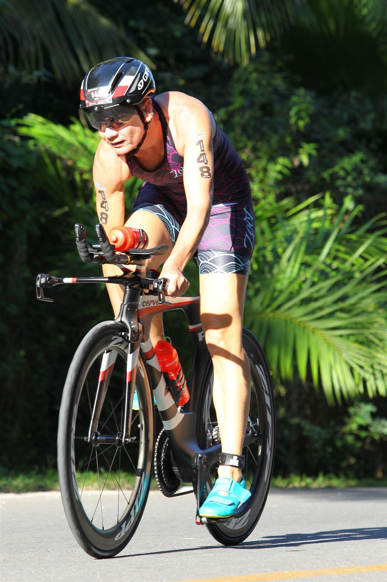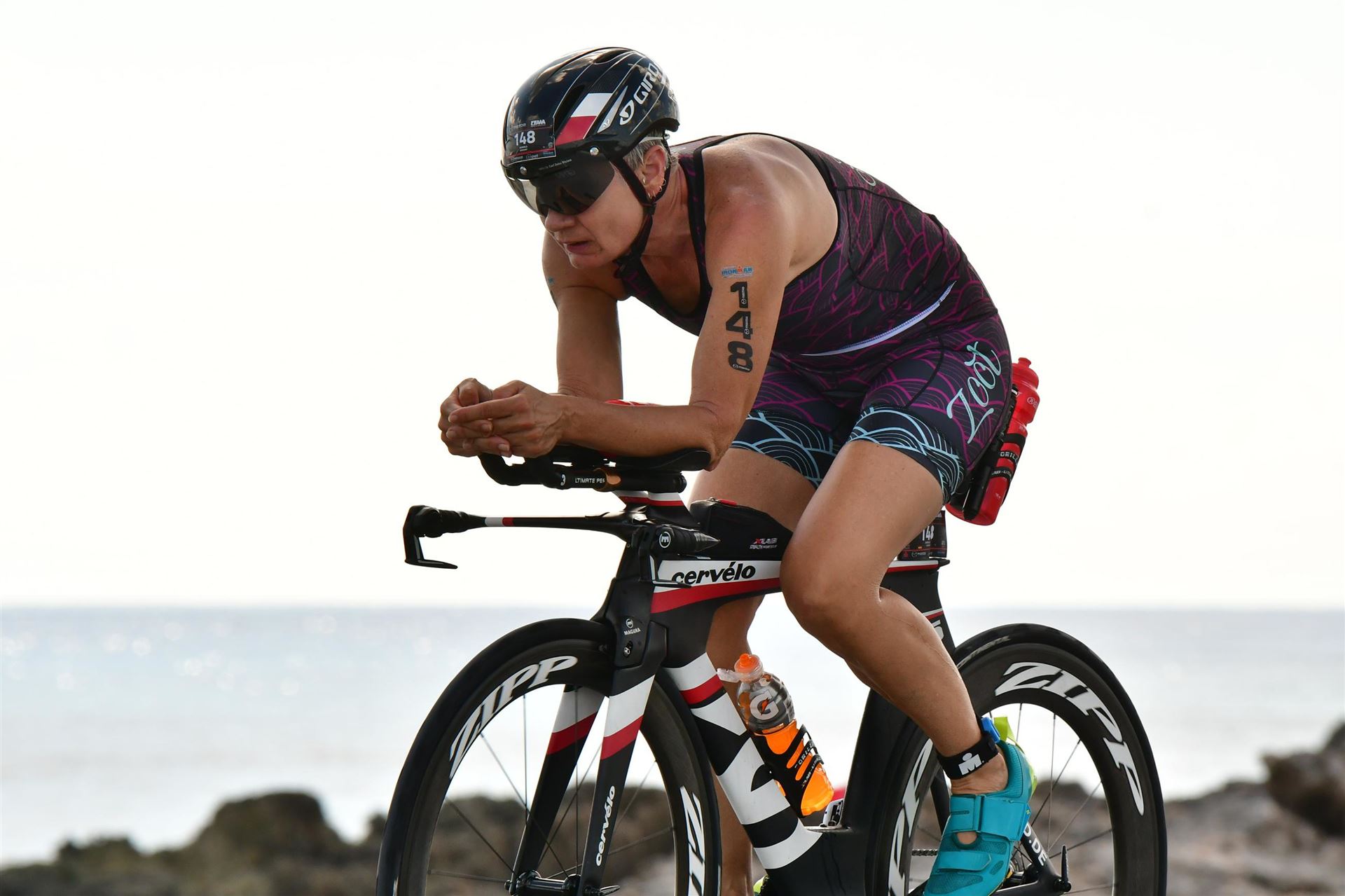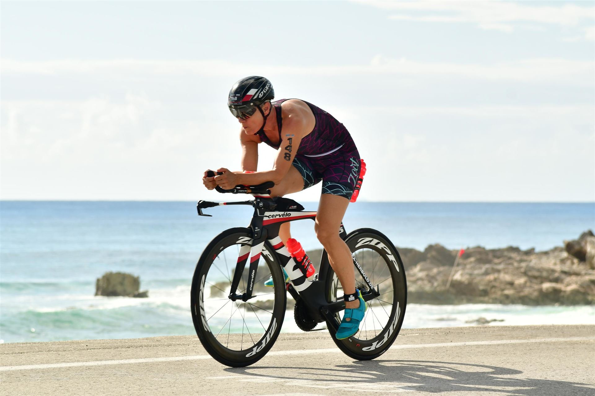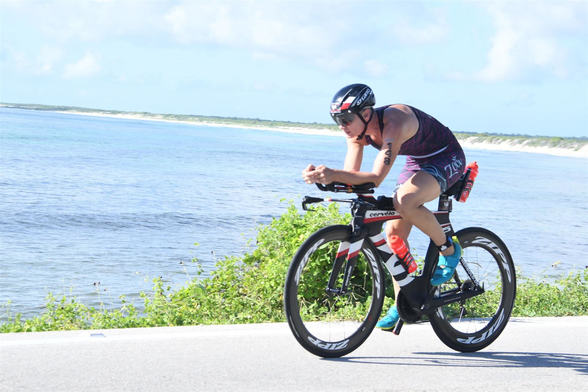 Zügig zum Rad und dann ab auf die erste Runde. Da mein Magen noch immer rebelliert verzichte ich die erste Zeit auf jegliche Nahrungs- bzw. Flüssigkeitsaufnahme. Das erste Stück geht an diversen Hotels und Restaurants vorbei. Die Strecke ist überwiegend geradeaus. Nichts spektakuläres. Ein großes Teilstück verläuft parallel zum Meer, der Ausblick ist einfach toll. Schön, wenn man während einem Rennen noch solch ein Panorama genießen kann. Am Anfang ist die Radstrecke noch etwas voll, das wird jedoch von Kilometer zu Kilometer besser. Ich fühle mich sehr gut und kann mein Tempo fahren. Ich freue mich, wenn ich den ein- oder anderen Athleten überholen kann, das bringt zusätzliche Motivation. Ich versuche die meiste Zeit abgelegt zu fahren, das minimiert den Windwiderstand. Die Verpflegungsstellen sind sehr dicht beieinander, man kann seine Flaschen auffüllen und sich mit Wasser kühlen. Ist perfekt organisiert. Insgesamt muss man 3 Runden fahren. 2 x 63 Kilometer und die letzte Runde noch 54 Kilometer. Ich versuche möglichst konstant mein Tempo zu fahren und fühle mich ausgezeichnet. Es steht ja im Anschluss noch ein Marathon an. Das Gefühl ist toll, als ich nach 3 Runden in Richtung Wechselzone abbiegen kann und bin erstaunt, wie viele erst jetzt auf die 3. Runde gehen. Schnell das TT Bike an einen Helfer abgeben und dann mit dem Laufbeutel ins Wechselzelt. Meine Radzeit von 5:30:34 ist eine tolle Zeit für mich.