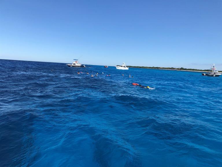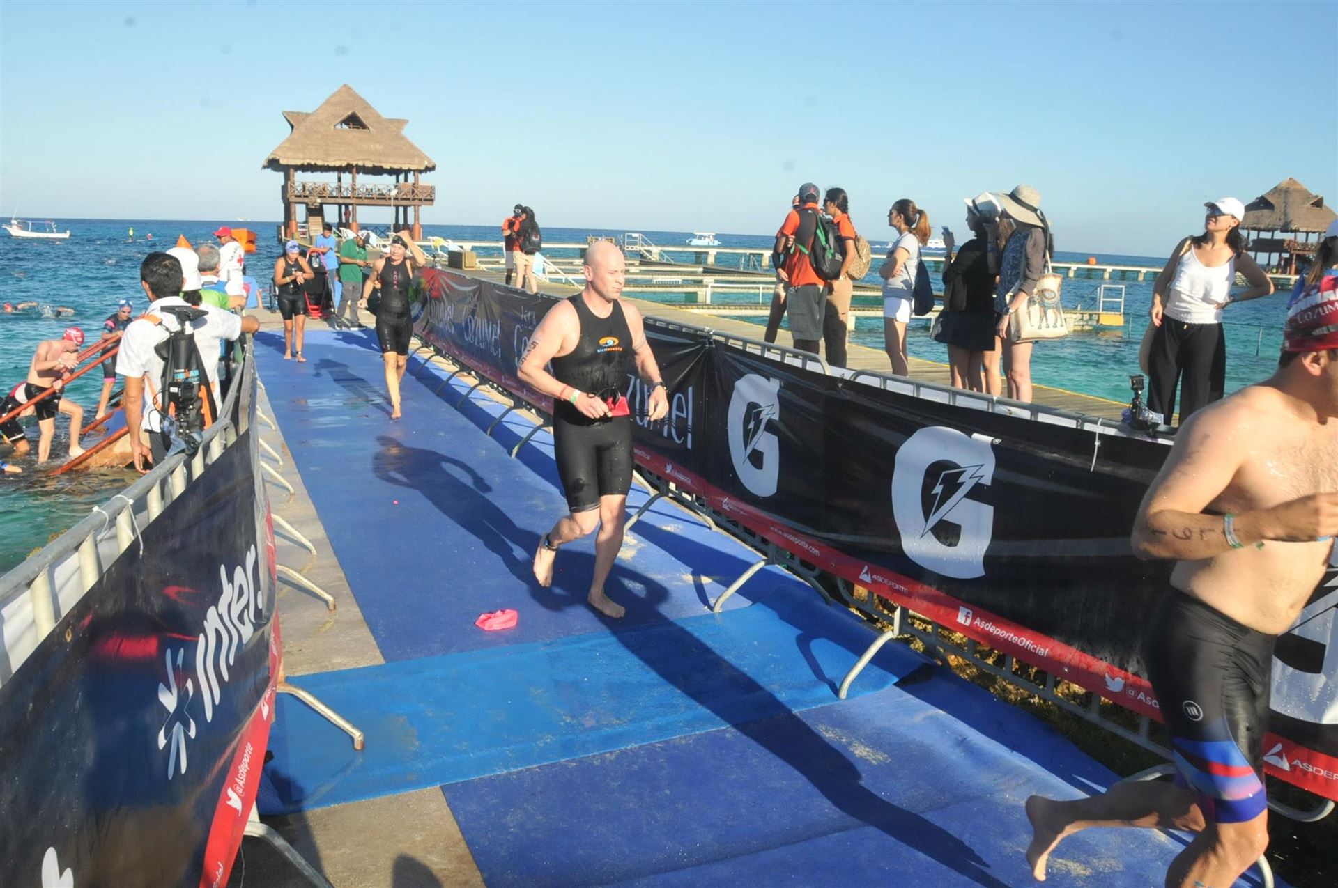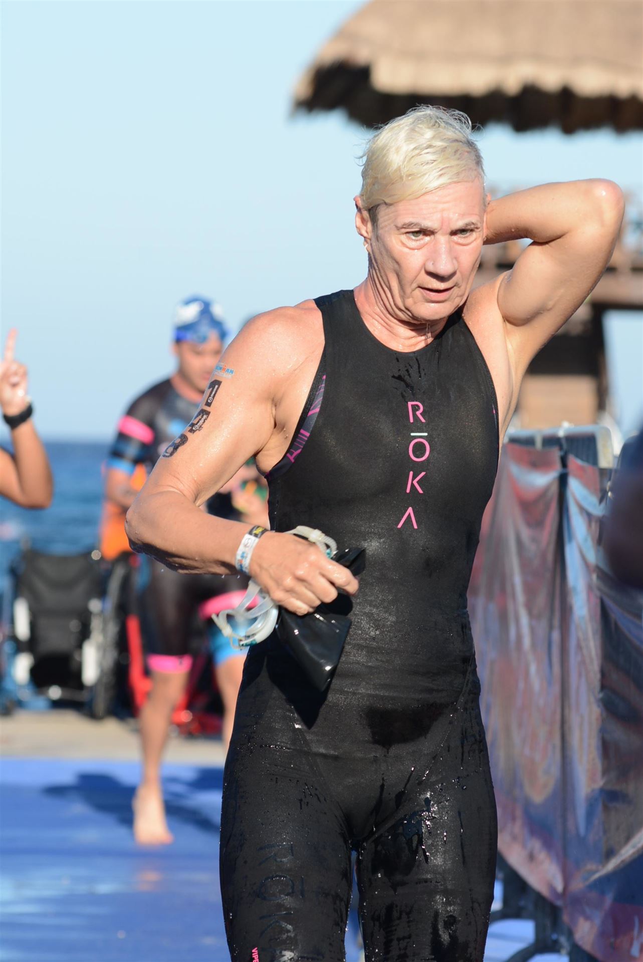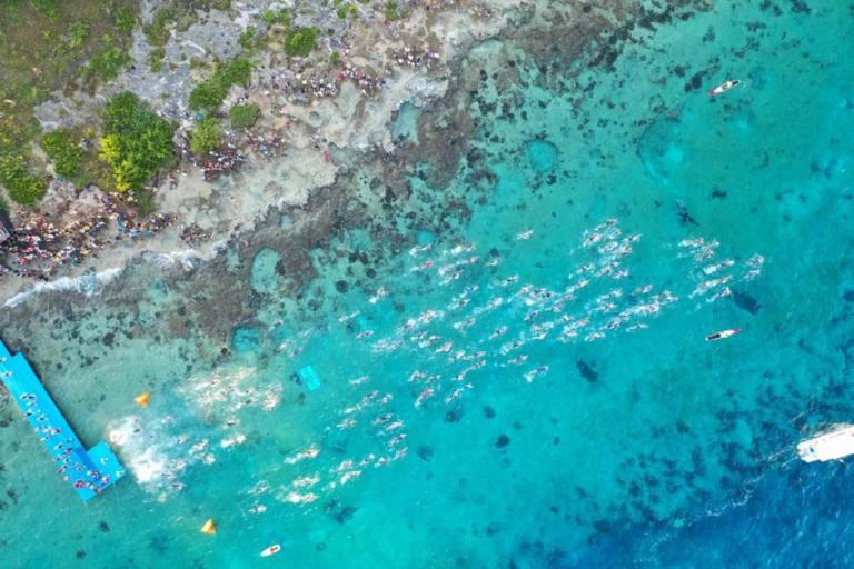 Ab 7:30 Uhr gehen die Agegrouper ins Wasser. Durch den Rollingstart gibt es kein Gedränge. Ich gehe circa um 7:42 Uhr ins Wasser. Es liegen 3,8 km im Meer schwimmen vor mir. Die Wellen meinen es an diesem Morgen gut mit mir. Der Seegang ist verhalten, meine Übelkeit erträglich. Man hat das Gefühl, man schwimmt in einem Aquarium. Man hat eine tolle Sicht. Ab und an sieht man einen Taucher am Meeresboden. Sicherheit wird groß geschrieben. Zumal aufgrund der Wassertemperatur ohne Neo geschwommen wird. Es gibt eine leichte Strömung, was die Schwimmzeit um einiges verkürzt. Die Strecke ist gut markiert, es geht 3.800 Meter in eine Richtung. Nach 1:06:04 steige ich aus dem Wasser.