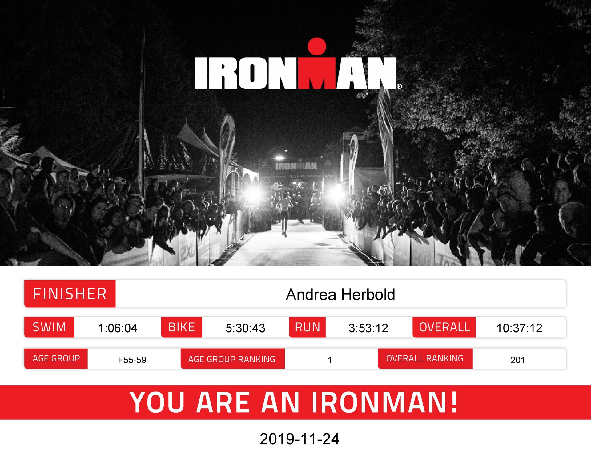 Die 3. Runde läuft ganz gut, sodass ich mit einer Gesamtzeit von 10:37:12 und mit dem 1. Platz in der AK über die Ziellinie laufe.