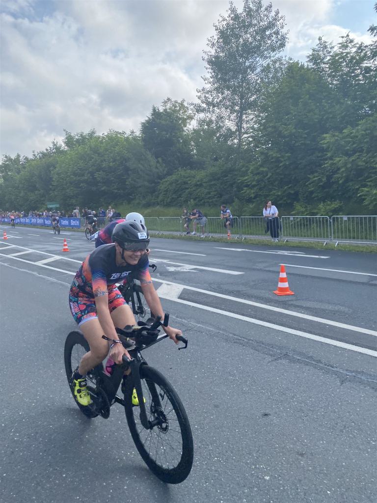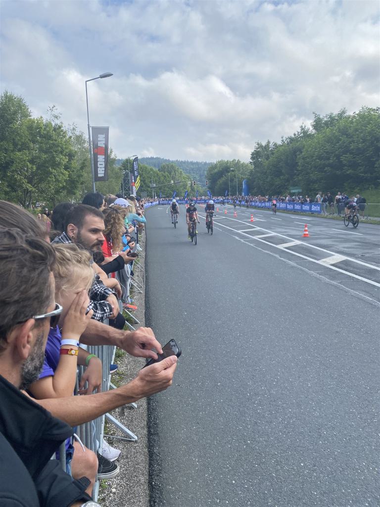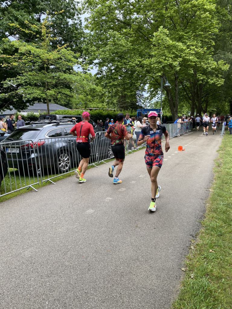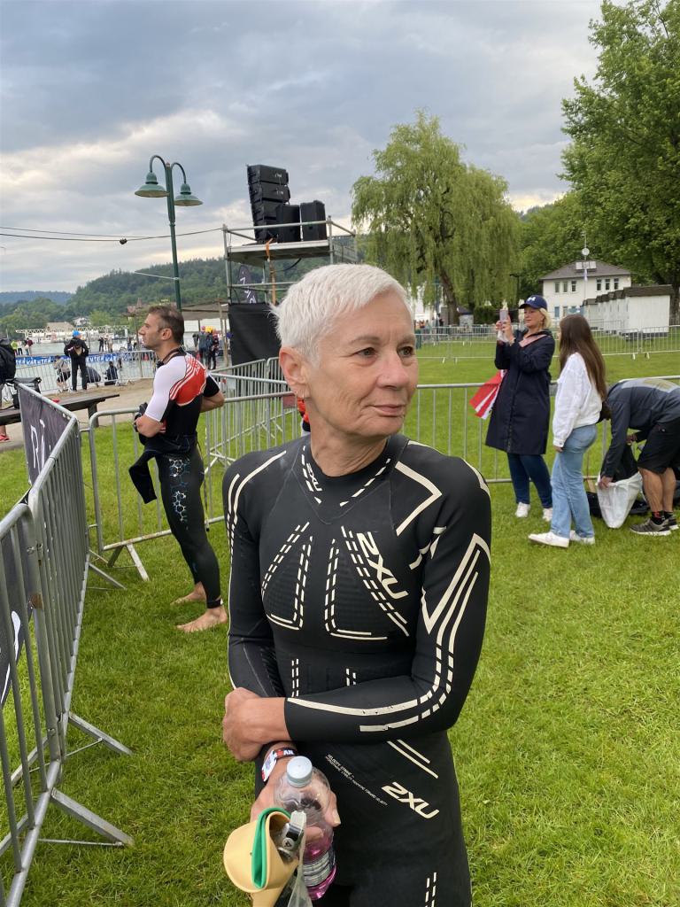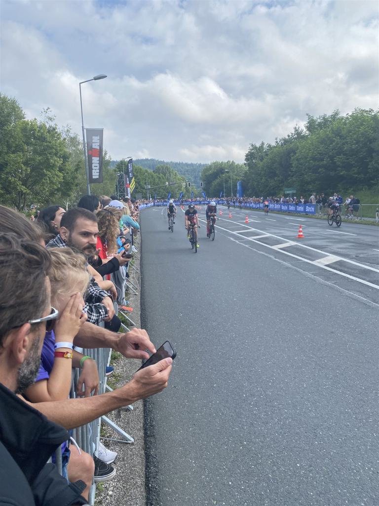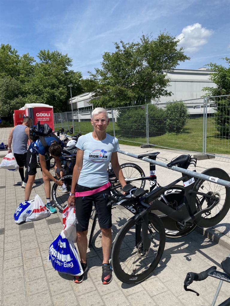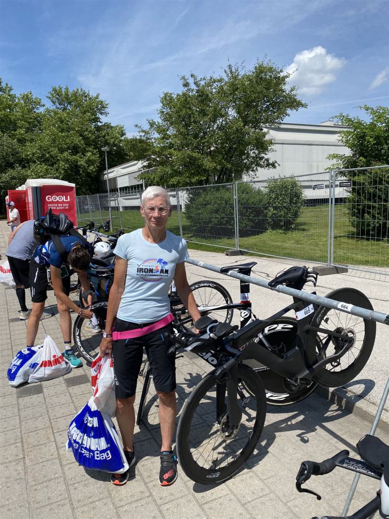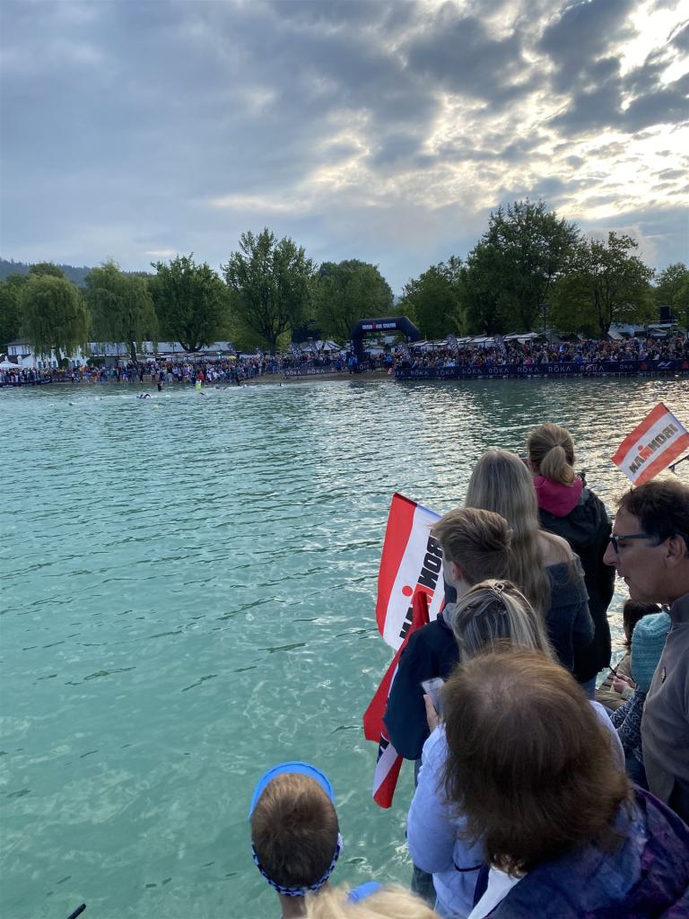 Geschwommen werden die 3,8 Kilometer im Wörthersee. Der See hat Trinkwasserqualität und ist relativ klar. Gestartet wird in Gruppen, man ordnet sich entsprechend der voraussichtlichen Schwimmzeit in eine Gruppe ein. Die Profimänner starteten um 6:30 Uhr, es gab keine Profifrauen. Ab 6:40 Uhr gingen die Agegrouper ins Wasser. Da ich keine Uhr beim Wettkampf trage konnte ich nicht einschätzen, wie lange es gedauert hat, bis ich ins Wasser konnte. Alle 5 Sekunden gingen 4 Athleten ins Wasser. Das Schwimmen war relativ entspannt, ich wurde nicht oft überholt und habe auch wenige Athleten überholt. Ich denke, die meisten Athleten haben sich korrekt eingeordnet. Der erste Streckenabschnitt klappt super, ich kann die Bojen sehr gut erkennen. Beim Rückweg in Richtung Lendkanal hatte ich leichte Schwierigkeiten mit den Bojen. War aber nicht schlimm für mich, ich habe mich an den anderen Athleten orientiert. Den Eingang zum Lendkanal konnte ich nicht erkennen, ohne Brille und dann noch direkt die Sonne, da habe mich absolut auf die anderen verlassen. Erstaunlicherweise hielt sich das Gedränge im Lendkanal auch in Grenzen, ich hatte mich Mental auf dichtes Gedränge und evtl. auch Schläge eingestellt. Nichts davon ist passiert. Das Schöne an diesem Kanal sind die Zuschauer auf beiden Seiten, die Stimmung ist super. Der Schwimmausstieg ist am Parkhotel, die Strecke bis in die Wechselzone ist relativ lang. Ich komme als 2. Frau in meiner AK aus dem Wasser. Mit meiner Schwimmzeit von 1:19:50 bin ich zufrieden.