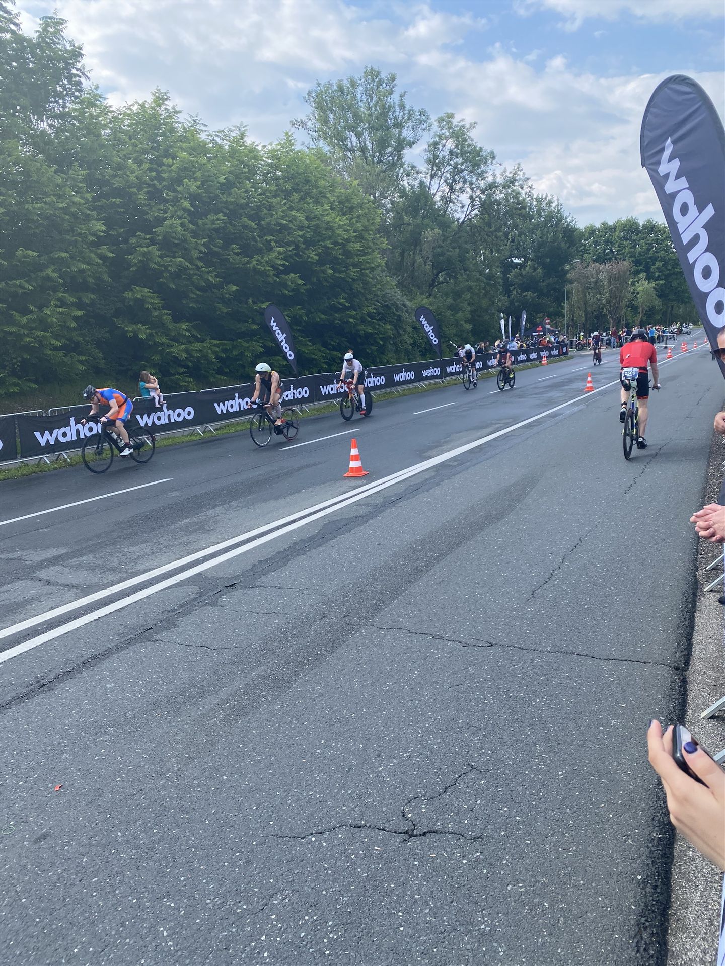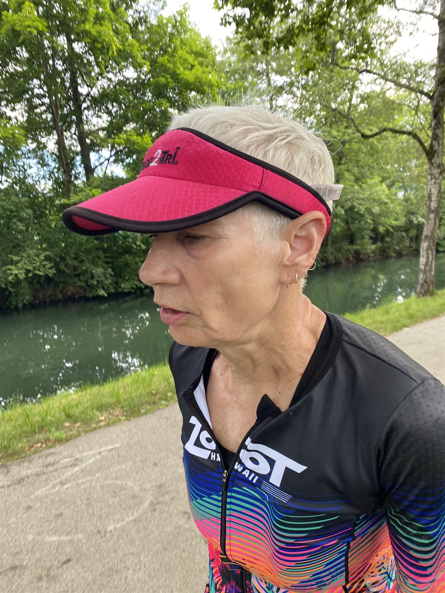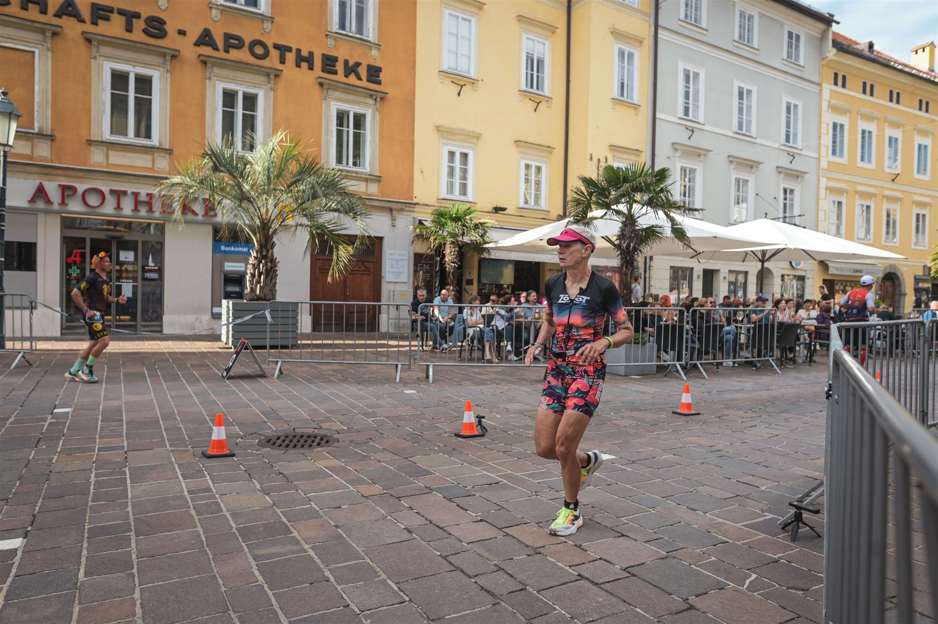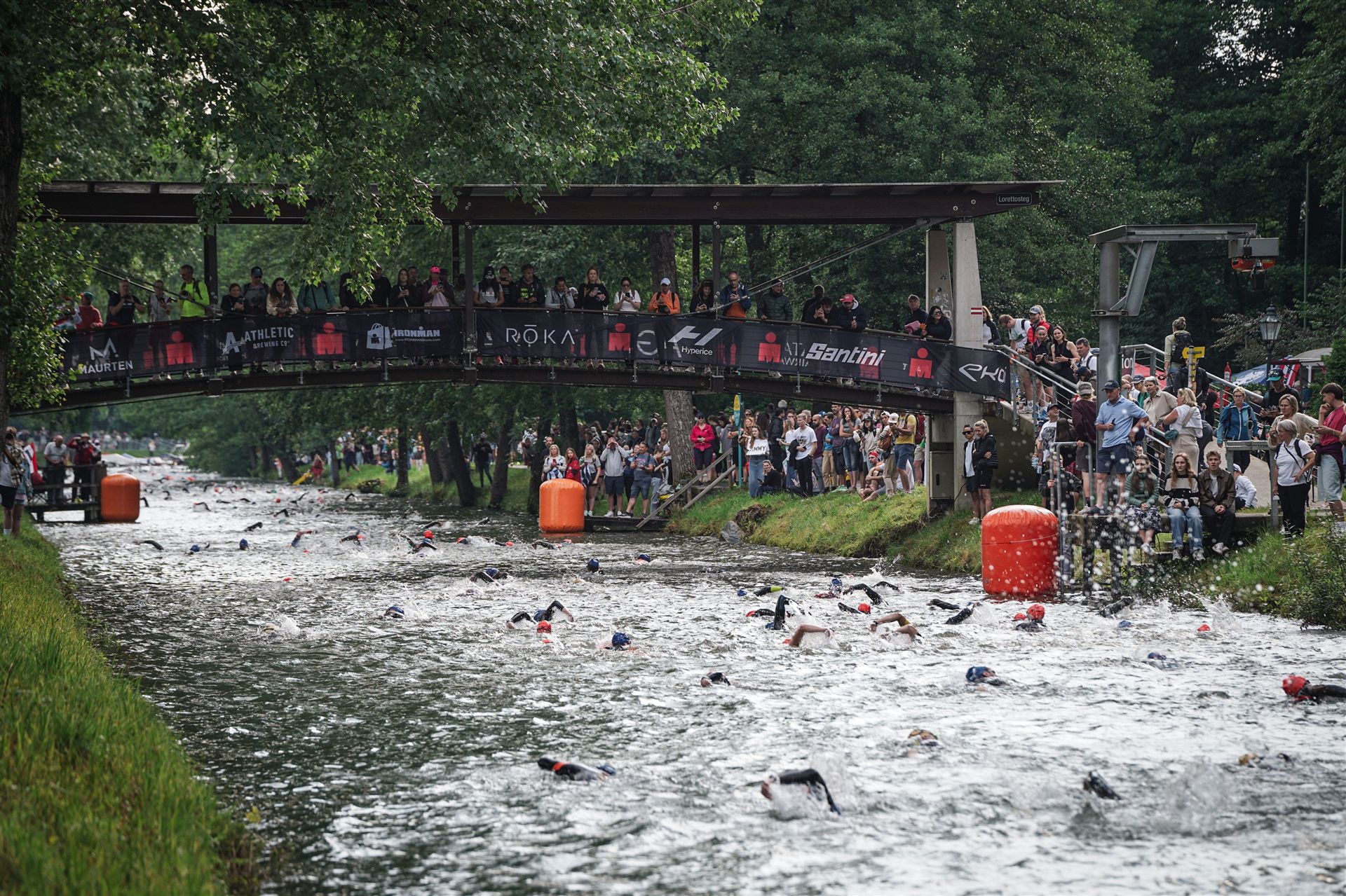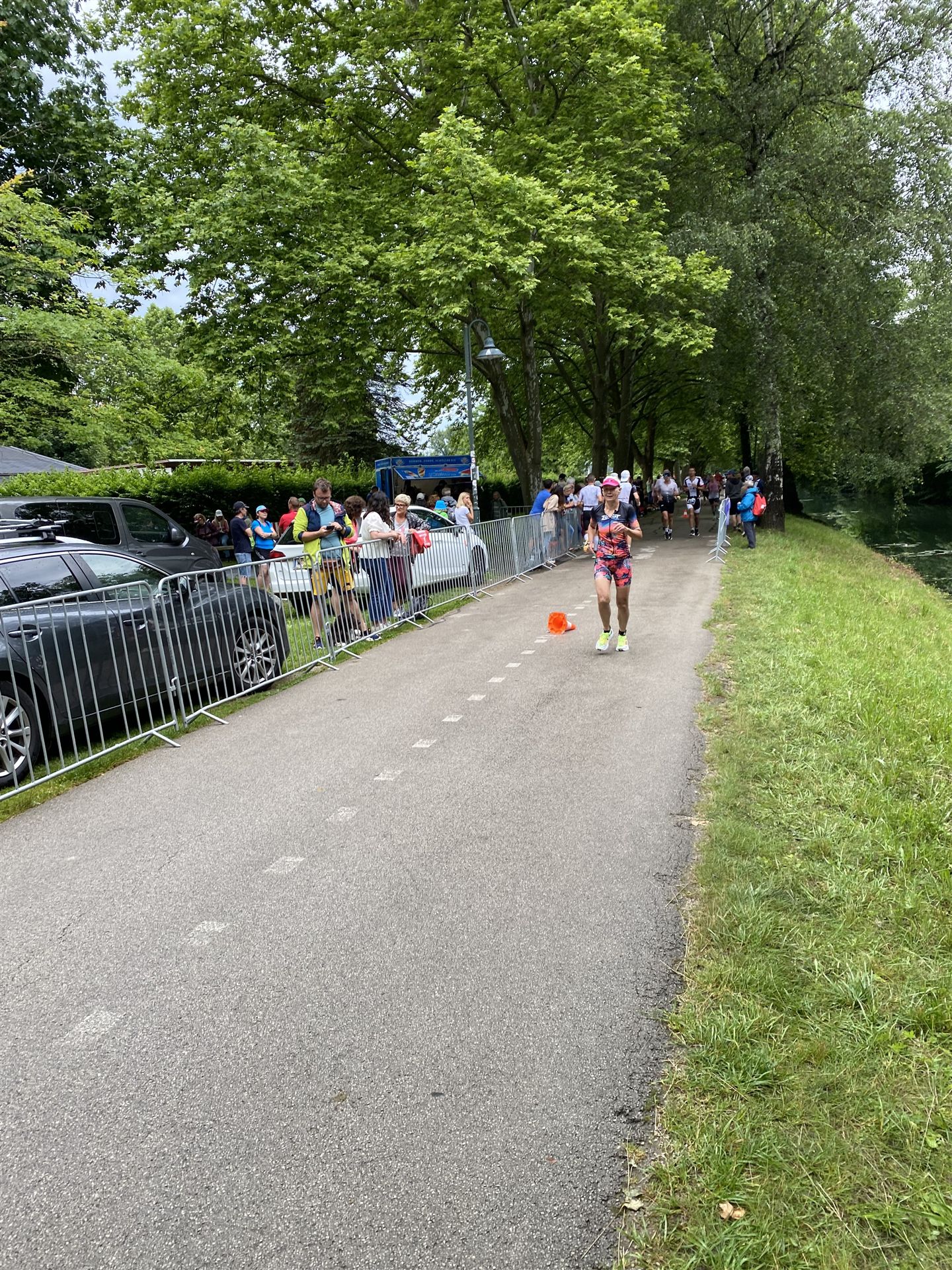 Geschwommen werden die 3,8 Kilometer im Wörthersee. Der See hat Trinkwasserqualität und ist relativ klar. Gestartet wird in Gruppen, man ordnet sich entsprechend der voraussichtlichen Schwimmzeit in eine Gruppe ein. Die Profimänner starteten um 6:30 Uhr, es gab keine Profifrauen. Ab 6:40 Uhr gingen die Agegrouper ins Wasser. Da ich keine Uhr beim Wettkampf trage konnte ich nicht einschätzen, wie lange es gedauert hat, bis ich ins Wasser konnte. Alle 5 Sekunden gingen 4 Athleten ins Wasser. Das Schwimmen war relativ entspannt, ich wurde nicht oft überholt und habe auch wenige Athleten überholt. Ich denke, die meisten Athleten haben sich korrekt eingeordnet. Der erste Streckenabschnitt klappt super, ich kann die Bojen sehr gut erkennen. Beim Rückweg in Richtung Lendkanal hatte ich leichte Schwierigkeiten mit den Bojen. War aber nicht schlimm für mich, ich habe mich an den anderen Athleten orientiert. Den Eingang zum Lendkanal konnte ich nicht erkennen, ohne Brille und dann noch direkt die Sonne, da habe mich absolut auf die anderen verlassen. Erstaunlicherweise hielt sich das Gedränge im Lendkanal auch in Grenzen, ich hatte mich Mental auf dichtes Gedränge und evtl. auch Schläge eingestellt. Nichts davon ist passiert. Das Schöne an diesem Kanal sind die Zuschauer auf beiden Seiten, die Stimmung ist super. Der Schwimmausstieg ist am Parkhotel, die Strecke bis in die Wechselzone ist relativ lang. Ich komme als 2. Frau in meiner AK aus dem Wasser. Mit meiner Schwimmzeit von 1:19:50 bin ich zufrieden.