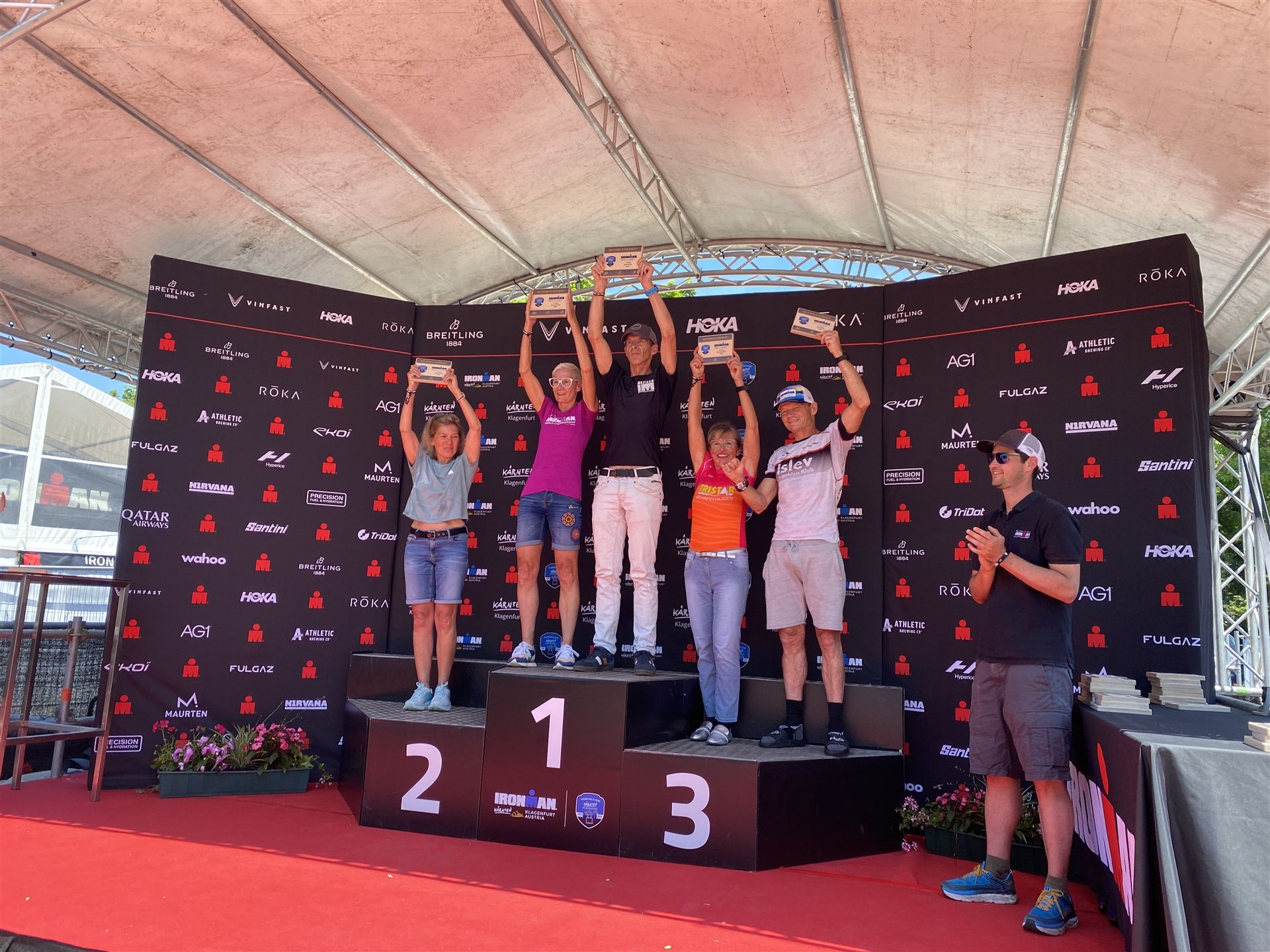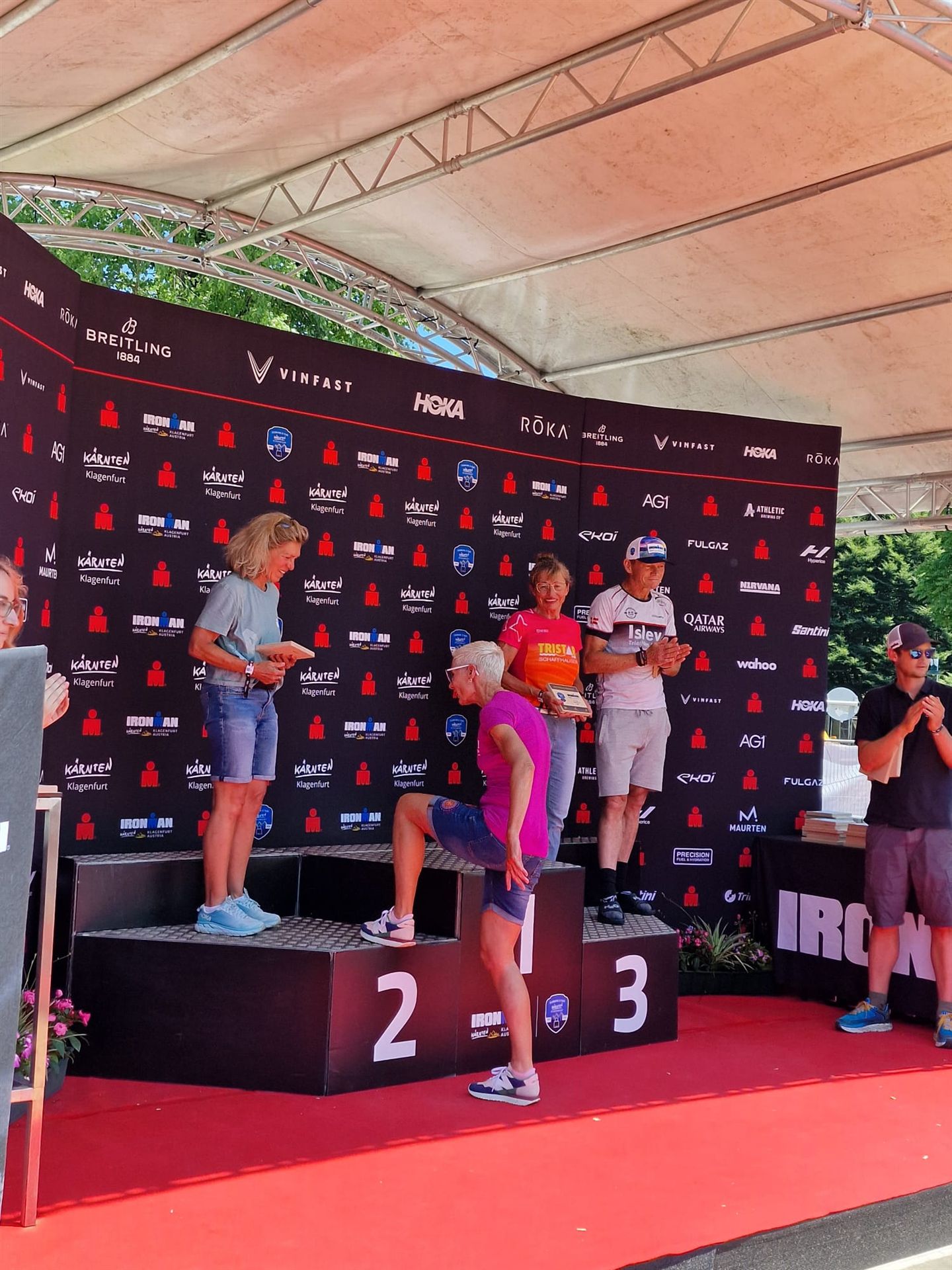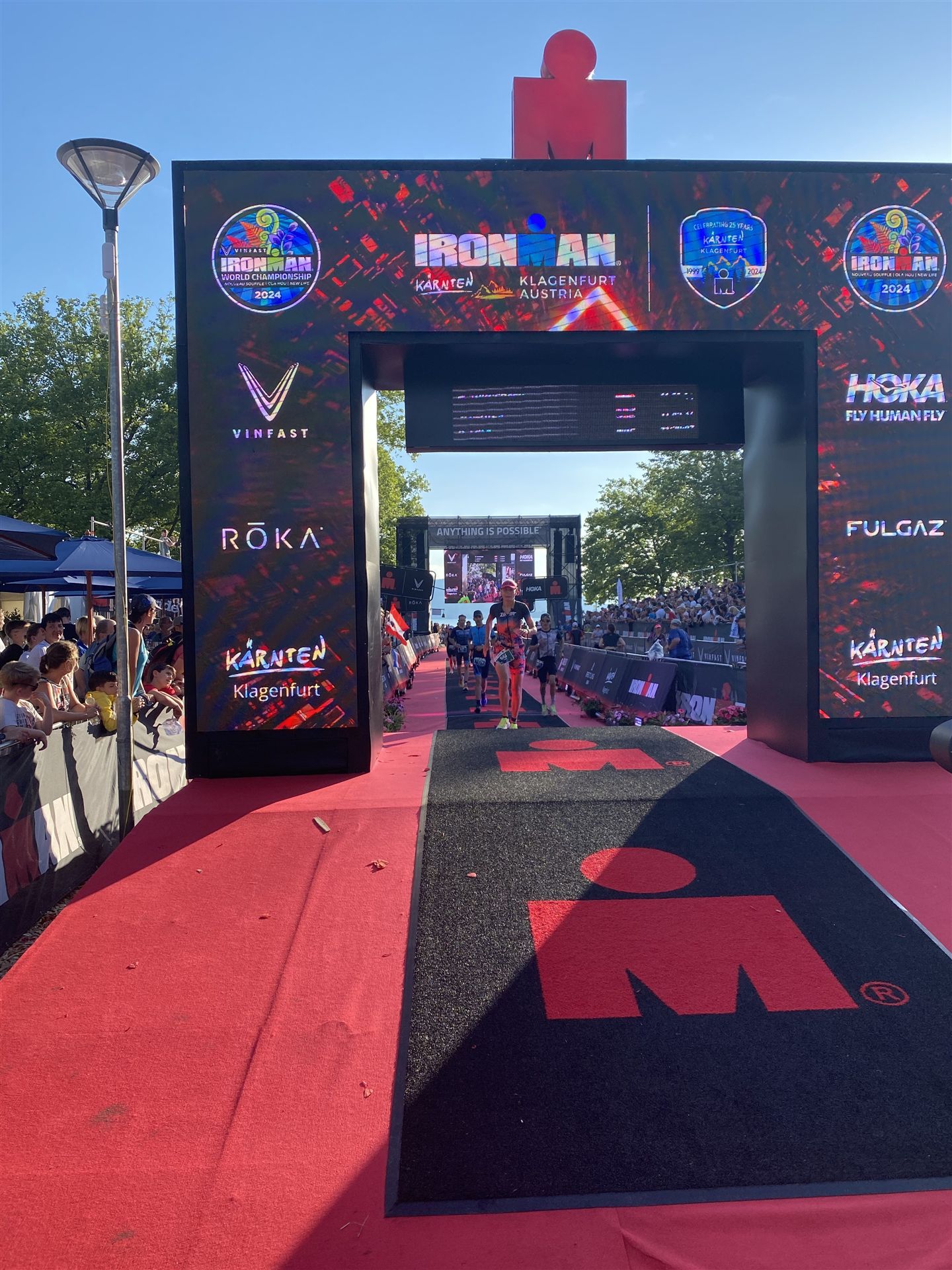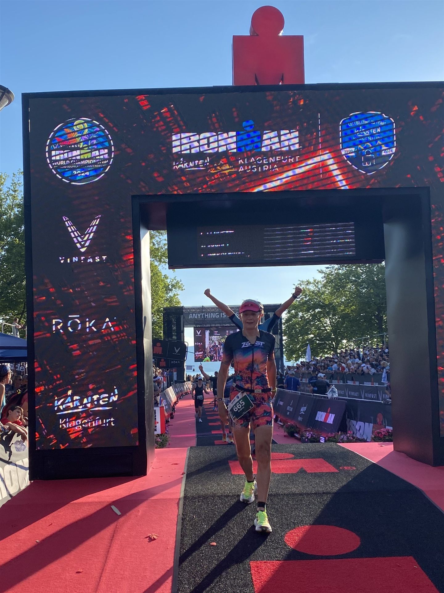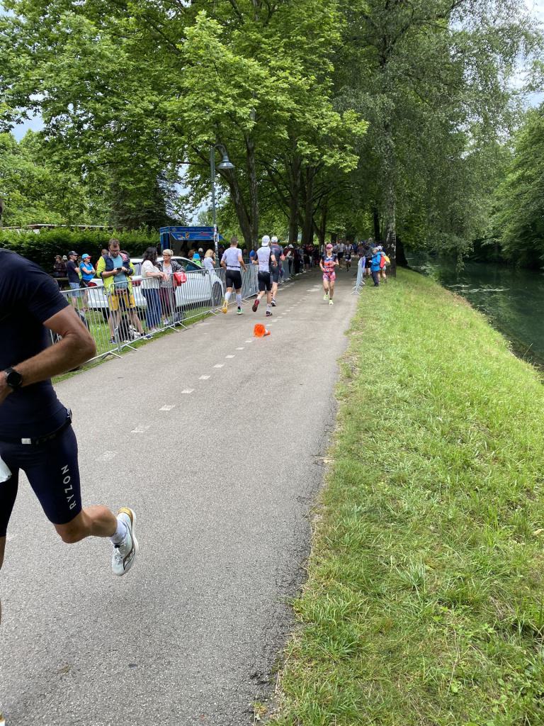 Ab in die Wechselzone und die Radschuhe mit den Laufschuhen tauschen. Aufgrund der Temperatur entscheide ich mich, mein Trikot anzulassen. Ich gehe als erste Frau in meiner AK mit einem Vorsprung von circa 18 Minuten auf die Laufstrecke. Nach dem ersten Kilometer geht es mir nicht so gut, ich fühle mich schlapp. Das kenne ich überhaupt nicht von mir. Anscheinend habe ich auf dem Rad nicht ausreichend gegessen. Normalerweise kann ich nach dem Rad direkt ohne Probleme los laufen, dieses Mal habe ich Probleme. Ich entscheide mich bis zur ersten Verpflegungsstelle Gehpausen einzulegen. An der ersten Verpflegungsstelle bin ich vorbei gelaufen, keine Ahnung weshalb. Das ist Wettkampf, da passieren solche Dingen. Bei der 2. Verpflegungsstelle nehme ich mir etwas Zeit und esse und trinke ordentlich. Danach geht es mir viel besser. Nach den ersten 10 Kilometern konnte ich meinen Vorsprung auf die Zweite bereits etwas ausbauen. Ich halte bei jeder Verpflegungsstelle an und nehme Flüssigkeit bzw. Gel zu mir. Der Vorsprung wird immer größer. Werner hält mich auf dem Laufenden. Ab circa Kilometer 32 habe ich Probleme mit der Verpflegung. Ich kann nichts mehr aufnehmen, mein Magen rebelliert. Ich entscheide spontan, dass ich es mit Cola probiere. Die Strategie geht auf, mein Magen rebelliert nicht mehr. Da ich bereits einen Vorsprung von über 45 Minuten auf den letzten 10 Kilometern habe gehe ich auf Nummer sicher. Ich nehme nur noch Cola zu mir und lege die ein- oder andere Gehpause ein. Ich bin zuversichtlich als Erste ins Ziel zu kommen. Bei Kilometer 39 bin ich schon leicht euphorisch, laufe jedoch weiter verhalten. Kein unnötiges Risiko eingehen. Bei Kilometer 41 fange ich an innerlich zu jubeln. Auf dem letzten Kilometer sind alle Probleme vergessen, es geht in Richtung Ziel. Der Zieleinlauf ist für jeden Athleten etwas Besonderes. Direkt im Ziel wartet bereits Werner auf mich und überreicht mir die Finisher Medaille. Das ist ein toller Moment. Natürlich habe ich, wie immer, vergessen auf meine Endzeit zu schauen. Wichtig für mich ist, ins Ziel zu kommen. Natürlich freut man sich, wenn dann noch eine gute Zeit bzw. Platzierung raus komm. Den Marathon bin ich in einer Zeit von 4:13:33 gelaufen. Meine Gesamtzeit beträgt 11:51:30 Stunden. Wahnsinn, ich bin total begeistert mit dieser Zeit gefinisht zu haben. Die Zweite in meiner AK kommt erst 1:17 Stunden nach mir ins Ziel. Es ist toll wieviel Zeit ich noch rauslaufen konnte. Es war wieder ein tolles Erlebnis in Klagenfurt und ich bin dankbar bei diesem Jubiläum dabei sein zu können. Nach dem Wettkampf gibt es noch eine Woche Urlaub und Erholung, danach geht der Focus auf die Weltmeisterschaft in Nizza.