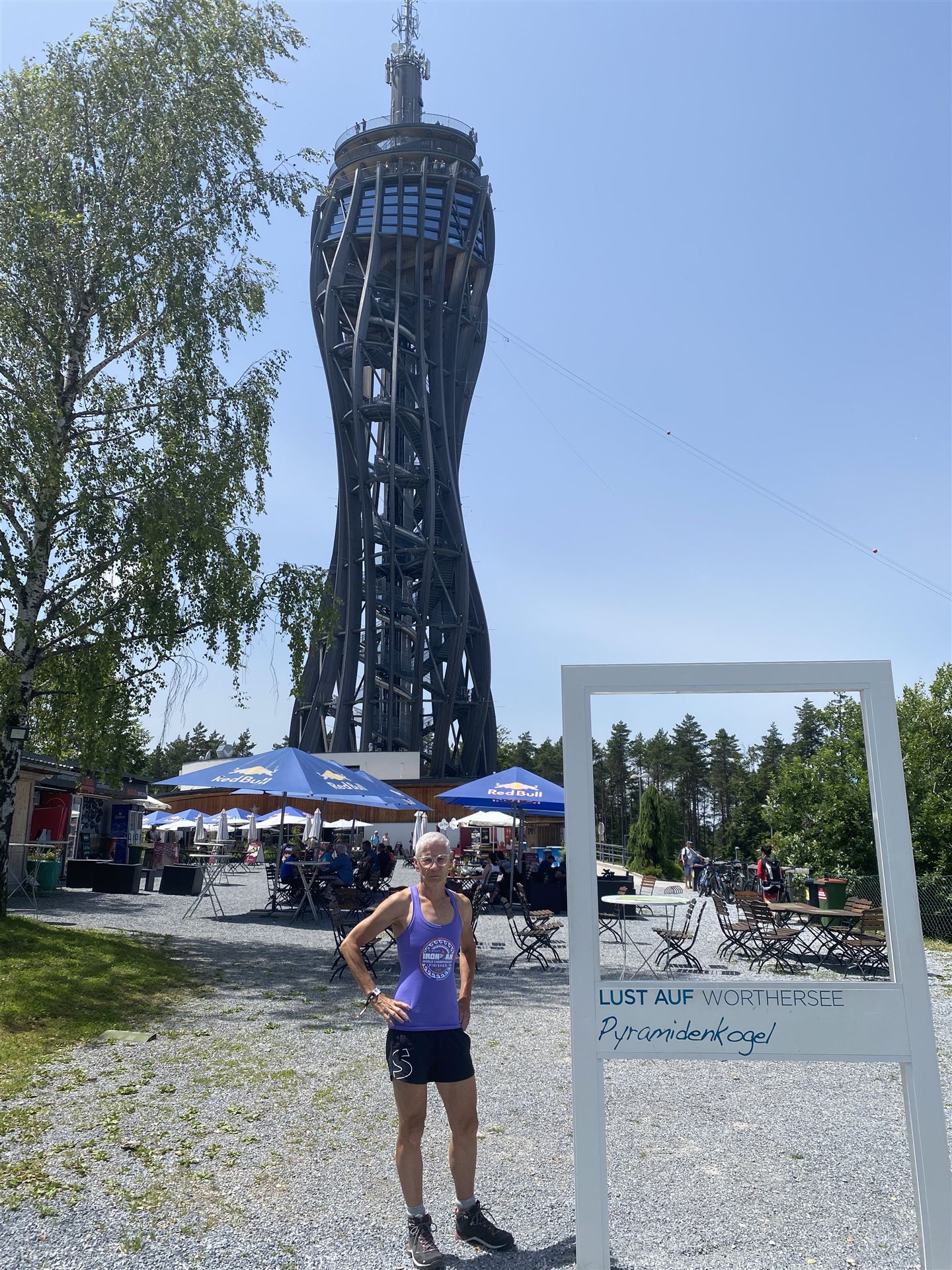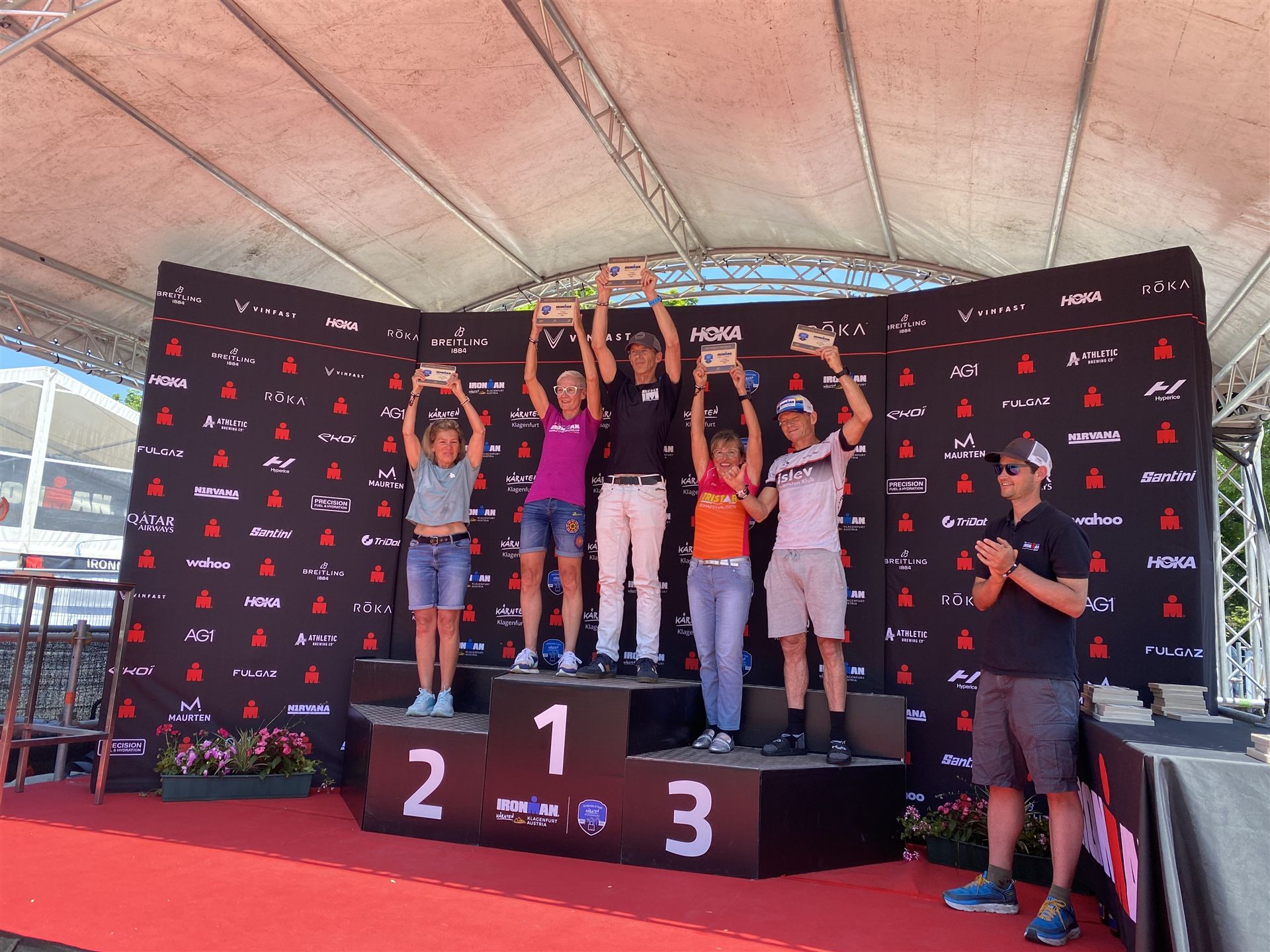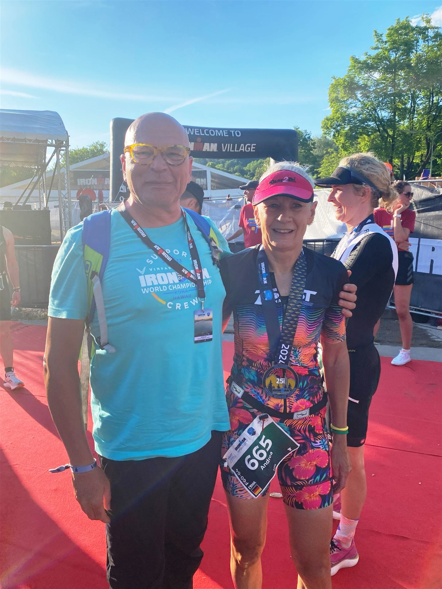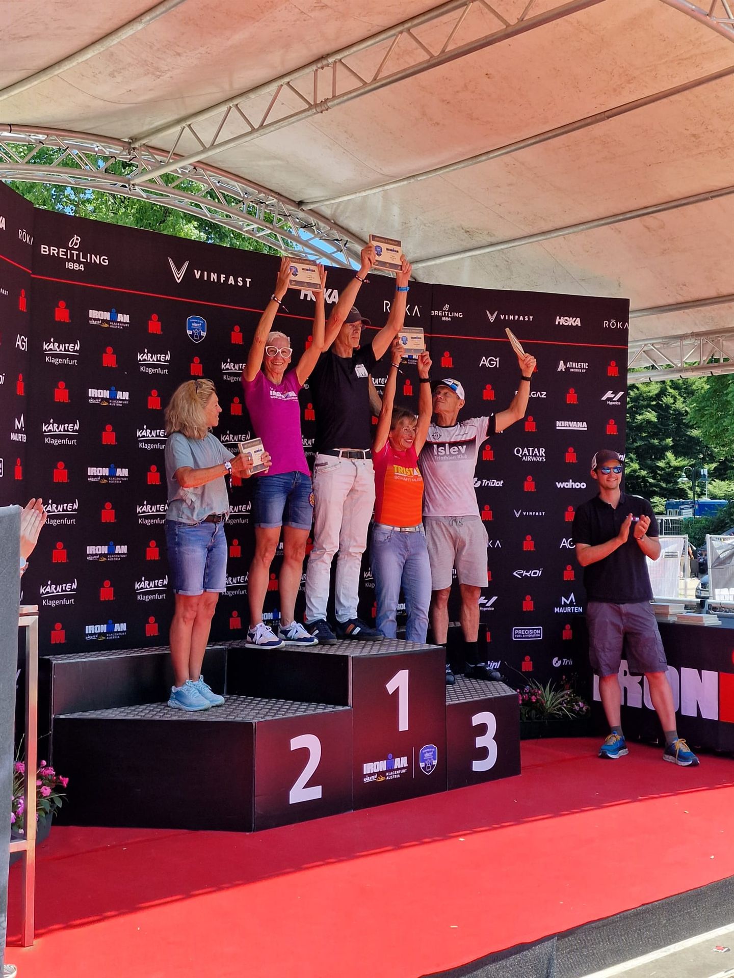 Ab in die Wechselzone und die Radschuhe mit den Laufschuhen tauschen. Aufgrund der Temperatur entscheide ich mich, mein Trikot anzulassen. Ich gehe als erste Frau in meiner AK mit einem Vorsprung von circa 18 Minuten auf die Laufstrecke. Nach dem ersten Kilometer geht es mir nicht so gut, ich fühle mich schlapp. Das kenne ich überhaupt nicht von mir. Anscheinend habe ich auf dem Rad nicht ausreichend gegessen. Normalerweise kann ich nach dem Rad direkt ohne Probleme los laufen, dieses Mal habe ich Probleme. Ich entscheide mich bis zur ersten Verpflegungsstelle Gehpausen einzulegen. An der ersten Verpflegungsstelle bin ich vorbei gelaufen, keine Ahnung weshalb. Das ist Wettkampf, da passieren solche Dingen. Bei der 2. Verpflegungsstelle nehme ich mir etwas Zeit und esse und trinke ordentlich. Danach geht es mir viel besser. Nach den ersten 10 Kilometern konnte ich meinen Vorsprung auf die Zweite bereits etwas ausbauen. Ich halte bei jeder Verpflegungsstelle an und nehme Flüssigkeit bzw. Gel zu mir. Der Vorsprung wird immer größer. Werner hält mich auf dem Laufenden. Ab circa Kilometer 32 habe ich Probleme mit der Verpflegung. Ich kann nichts mehr aufnehmen, mein Magen rebelliert. Ich entscheide spontan, dass ich es mit Cola probiere. Die Strategie geht auf, mein Magen rebelliert nicht mehr. Da ich bereits einen Vorsprung von über 45 Minuten auf den letzten 10 Kilometern habe gehe ich auf Nummer sicher. Ich nehme nur noch Cola zu mir und lege die ein- oder andere Gehpause ein. Ich bin zuversichtlich als Erste ins Ziel zu kommen. Bei Kilometer 39 bin ich schon leicht euphorisch, laufe jedoch weiter verhalten. Kein unnötiges Risiko eingehen. Bei Kilometer 41 fange ich an innerlich zu jubeln. Auf dem letzten Kilometer sind alle Probleme vergessen, es geht in Richtung Ziel. Der Zieleinlauf ist für jeden Athleten etwas Besonderes. Direkt im Ziel wartet bereits Werner auf mich und überreicht mir die Finisher Medaille. Das ist ein toller Moment. Natürlich habe ich, wie immer, vergessen auf meine Endzeit zu schauen. Wichtig für mich ist, ins Ziel zu kommen. Natürlich freut man sich, wenn dann noch eine gute Zeit bzw. Platzierung raus komm. Den Marathon bin ich in einer Zeit von 4:13:33 gelaufen. Meine Gesamtzeit beträgt 11:51:30 Stunden. Wahnsinn, ich bin total begeistert mit dieser Zeit gefinisht zu haben. Die Zweite in meiner AK kommt erst 1:17 Stunden nach mir ins Ziel. Es ist toll wieviel Zeit ich noch rauslaufen konnte. Es war wieder ein tolles Erlebnis in Klagenfurt und ich bin dankbar bei diesem Jubiläum dabei sein zu können. Nach dem Wettkampf gibt es noch eine Woche Urlaub und Erholung, danach geht der Focus auf die Weltmeisterschaft in Nizza.