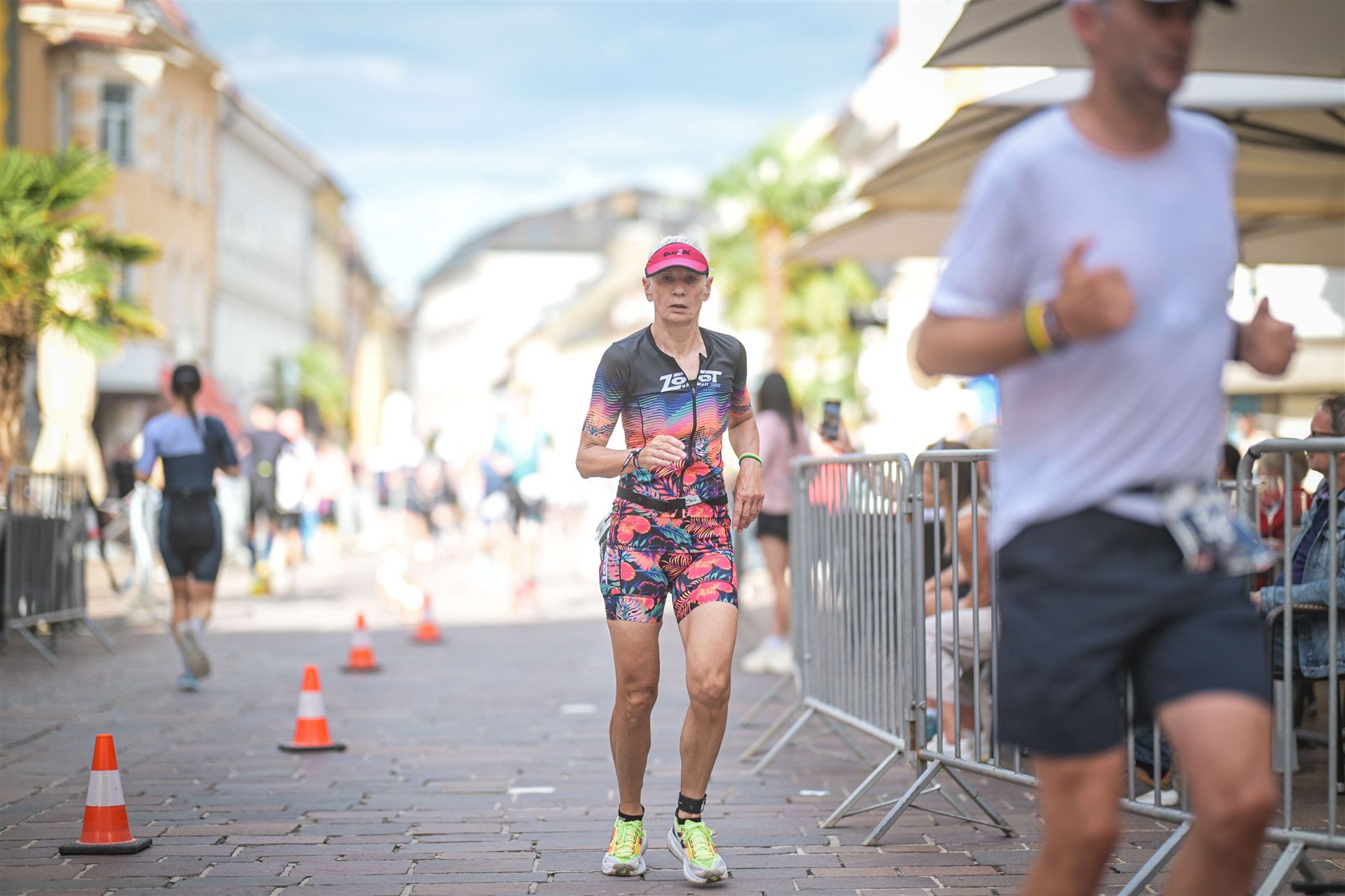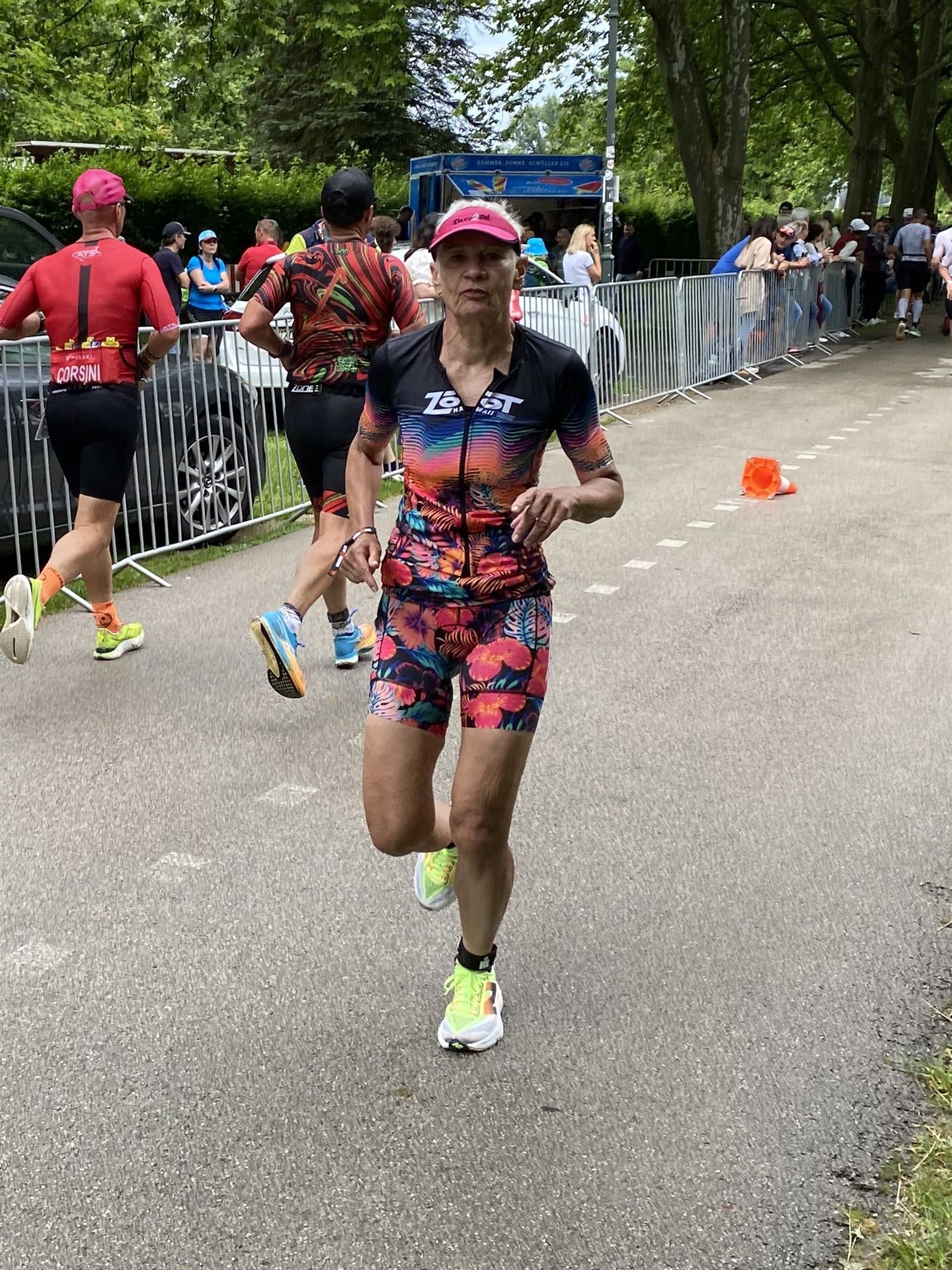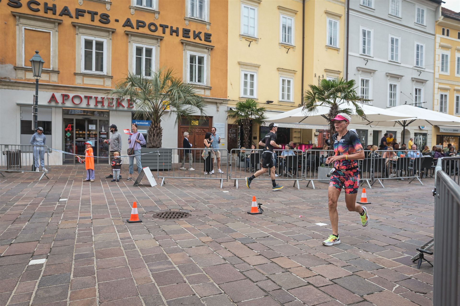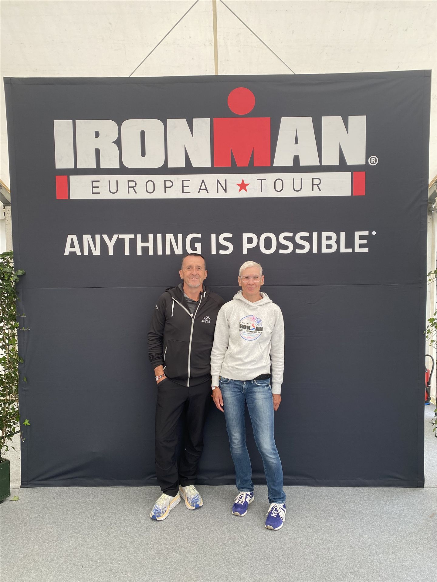 Ab in die Wechselzone und die Radschuhe mit den Laufschuhen tauschen. Aufgrund der Temperatur entscheide ich mich, mein Trikot anzulassen. Ich gehe als erste Frau in meiner AK mit einem Vorsprung von circa 18 Minuten auf die Laufstrecke. Nach dem ersten Kilometer geht es mir nicht so gut, ich fühle mich schlapp. Das kenne ich überhaupt nicht von mir. Anscheinend habe ich auf dem Rad nicht ausreichend gegessen. Normalerweise kann ich nach dem Rad direkt ohne Probleme los laufen, dieses Mal habe ich Probleme. Ich entscheide mich bis zur ersten Verpflegungsstelle Gehpausen einzulegen. An der ersten Verpflegungsstelle bin ich vorbei gelaufen, keine Ahnung weshalb. Das ist Wettkampf, da passieren solche Dingen. Bei der 2. Verpflegungsstelle nehme ich mir etwas Zeit und esse und trinke ordentlich. Danach geht es mir viel besser. Nach den ersten 10 Kilometern konnte ich meinen Vorsprung auf die Zweite bereits etwas ausbauen. Ich halte bei jeder Verpflegungsstelle an und nehme Flüssigkeit bzw. Gel zu mir. Der Vorsprung wird immer größer. Werner hält mich auf dem Laufenden. Ab circa Kilometer 32 habe ich Probleme mit der Verpflegung. Ich kann nichts mehr aufnehmen, mein Magen rebelliert. Ich entscheide spontan, dass ich es mit Cola probiere. Die Strategie geht auf, mein Magen rebelliert nicht mehr. Da ich bereits einen Vorsprung von über 45 Minuten auf den letzten 10 Kilometern habe gehe ich auf Nummer sicher. Ich nehme nur noch Cola zu mir und lege die ein- oder andere Gehpause ein. Ich bin zuversichtlich als Erste ins Ziel zu kommen. Bei Kilometer 39 bin ich schon leicht euphorisch, laufe jedoch weiter verhalten. Kein unnötiges Risiko eingehen. Bei Kilometer 41 fange ich an innerlich zu jubeln. Auf dem letzten Kilometer sind alle Probleme vergessen, es geht in Richtung Ziel. Der Zieleinlauf ist für jeden Athleten etwas Besonderes. Direkt im Ziel wartet bereits Werner auf mich und überreicht mir die Finisher Medaille. Das ist ein toller Moment. Natürlich habe ich, wie immer, vergessen auf meine Endzeit zu schauen. Wichtig für mich ist, ins Ziel zu kommen. Natürlich freut man sich, wenn dann noch eine gute Zeit bzw. Platzierung raus komm. Den Marathon bin ich in einer Zeit von 4:13:33 gelaufen. Meine Gesamtzeit beträgt 11:51:30 Stunden. Wahnsinn, ich bin total begeistert mit dieser Zeit gefinisht zu haben. Die Zweite in meiner AK kommt erst 1:17 Stunden nach mir ins Ziel. Es ist toll wieviel Zeit ich noch rauslaufen konnte. Es war wieder ein tolles Erlebnis in Klagenfurt und ich bin dankbar bei diesem Jubiläum dabei sein zu können. Nach dem Wettkampf gibt es noch eine Woche Urlaub und Erholung, danach geht der Focus auf die Weltmeisterschaft in Nizza.